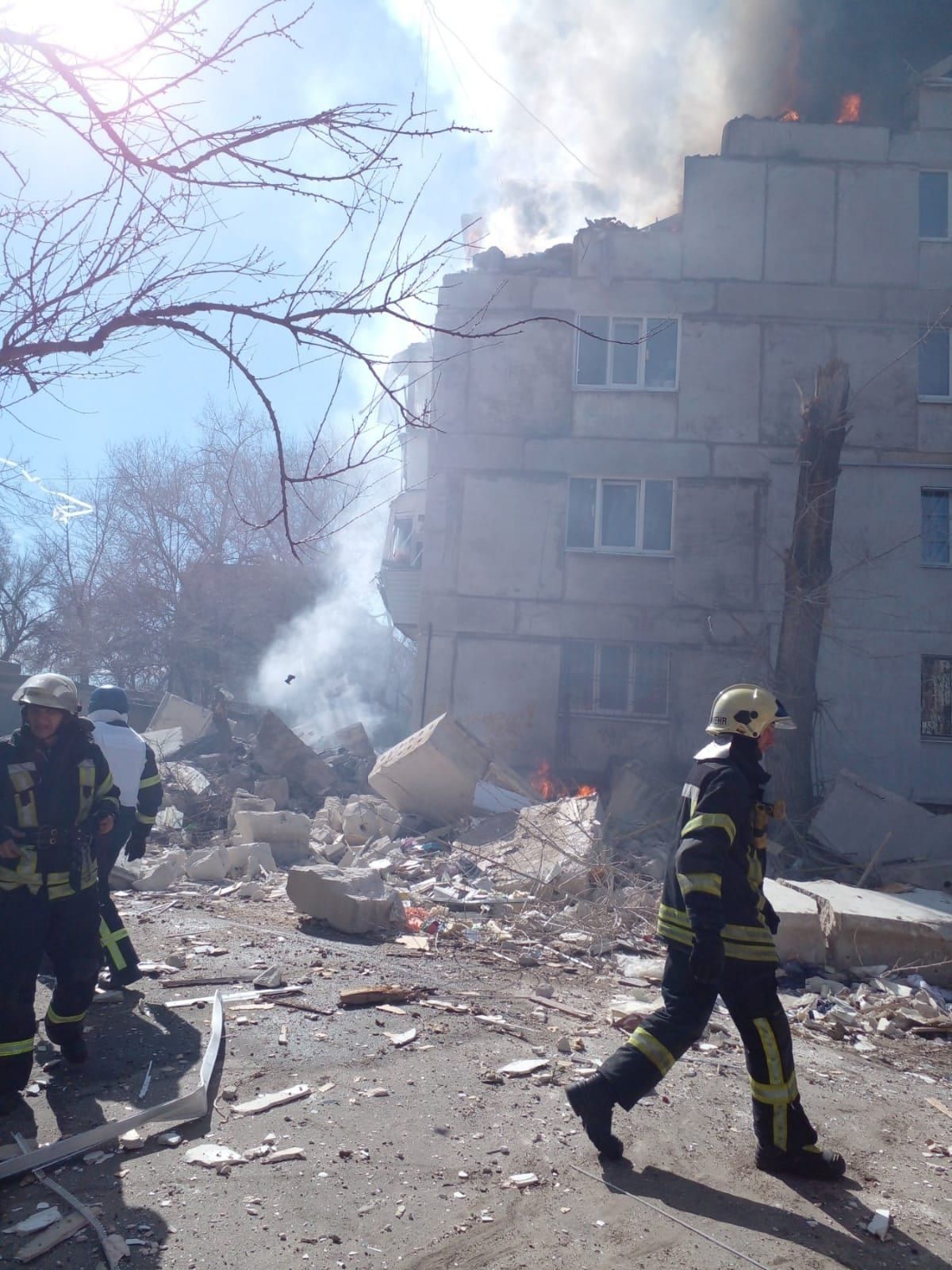 Фотографию опубликовал в телеграме глава администрации Николаевской области Виталий Ким. По его словам, из здания спаслись от 50 до 100 человек. Сейчас ищут еще восемь гражданских и трех военных.