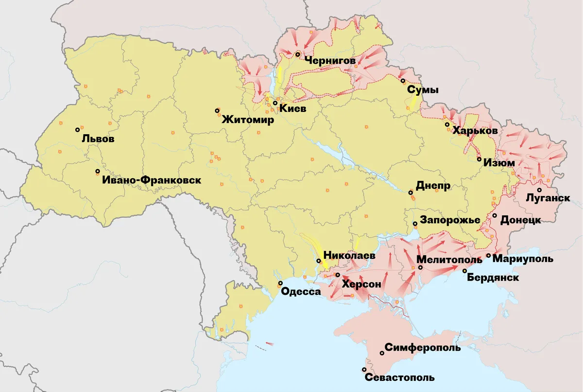 В боях на суше российская армия продвинулась от границ Украины в глубь страны не более чем на 300 километров, но, что более существенно, лишь в четырех местах она реально контролирует более или менее значительные территории: Донбасс; юг Запорожской и Херсонская области; север Черниговской области; районы севернее и северо-западнее Киева. В остальных местах прорывы были осуществлены вдоль трасс, что позволяет украинским войскам наносить удары по тылам и флангам группировок.