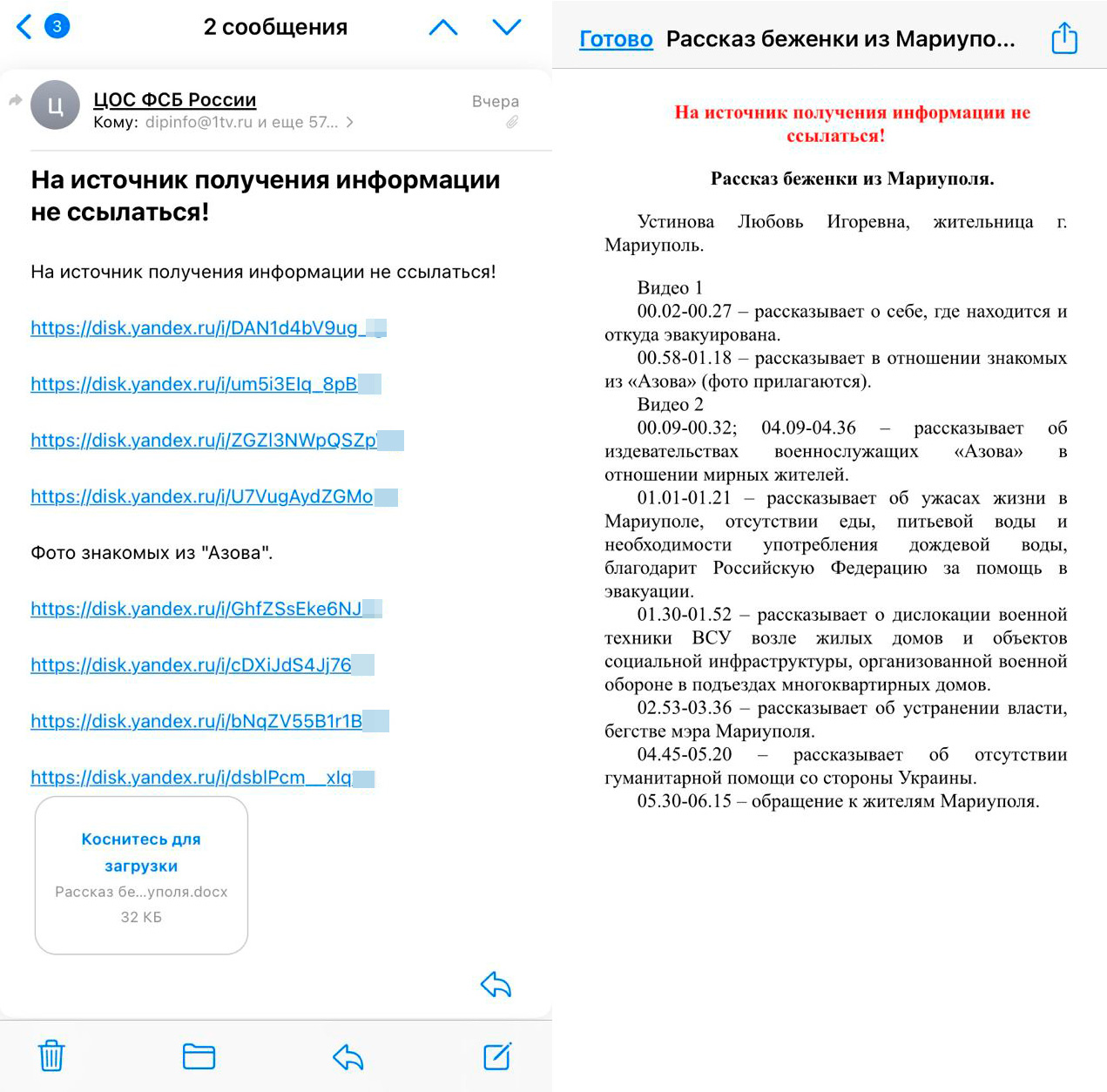 Распространенное государственными СМИ видео, на котором беженка из охваченного войной Мариуполя рассказывает о зверствах полка «Азов», было разослано пресс-службой ФСБ с требованием не ссылаться на источник. После эвакуации в Россию девушку долго допрашивали и изучали ее телефон — больше недели она не могла связаться с семьей. Собеседник «Медиазоны» утверждает, что ФСБ рассылала еще несколько подобных роликов.
