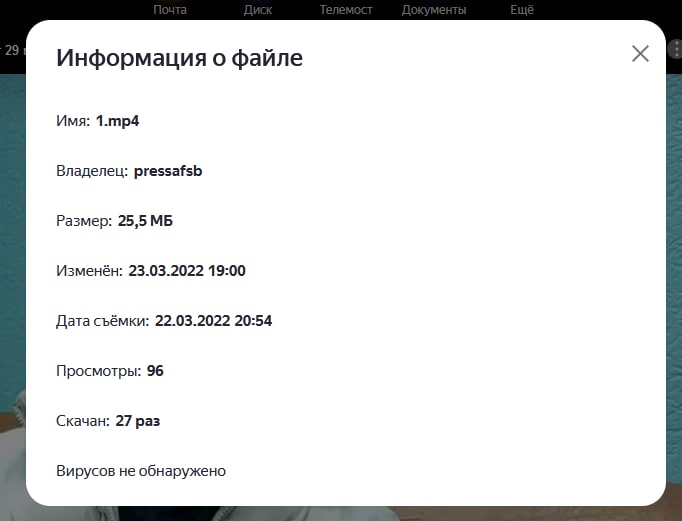 Все материалы для прессы сотрудники ЦОС залили на «Яндекс.Диск». Владельцем файлов указан аккаунт pressafsb, последние изменения — 23 марта в 19:00. Файлы были скачаны двумя-тремя десятками пользователей.