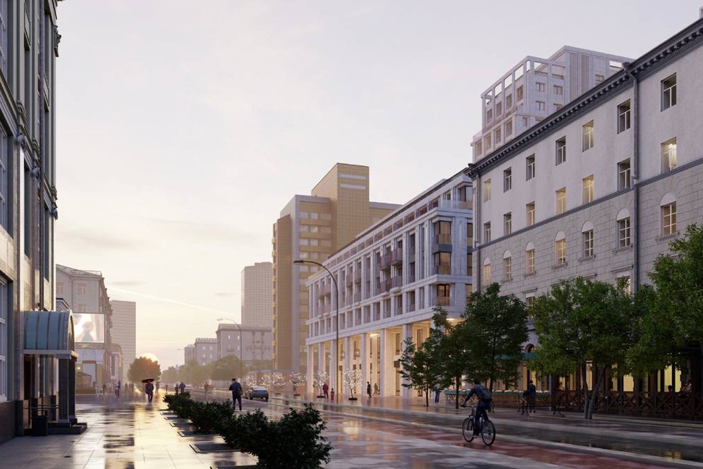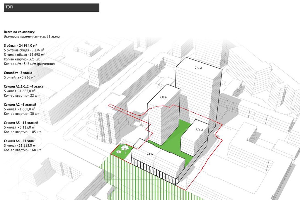 «Фасадом будет пятиэтажное административное здание с колоннами, а за ним три жилые высотки. Кто будет застройщиком ещё неизвестно», — отметили в объединении.