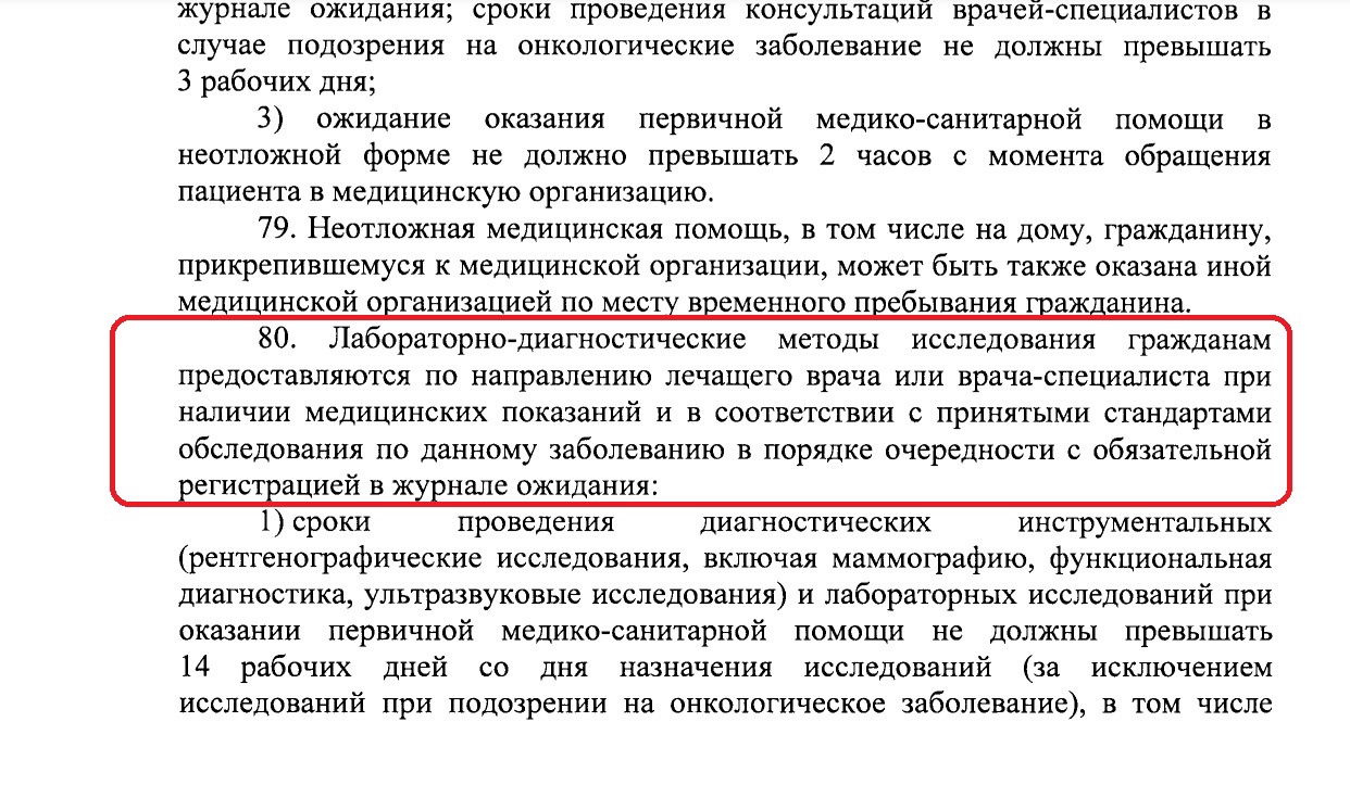 Параллельно с этим продолжаем изучать действующее законодательство и искать, за что можно еще зацепиться. Одним из ключевых документов, в соответствии с которым оказывается бесплатная медицинская помощь гражданам в регионе - Территориальная программа государственных гарантий. В частности, пункт 80 Терпрограммы устанавливает проведение лабораторно-диагностических методов исследования на основании направления лечащего врача или врача-специалиста при наличии медицинских показаний.