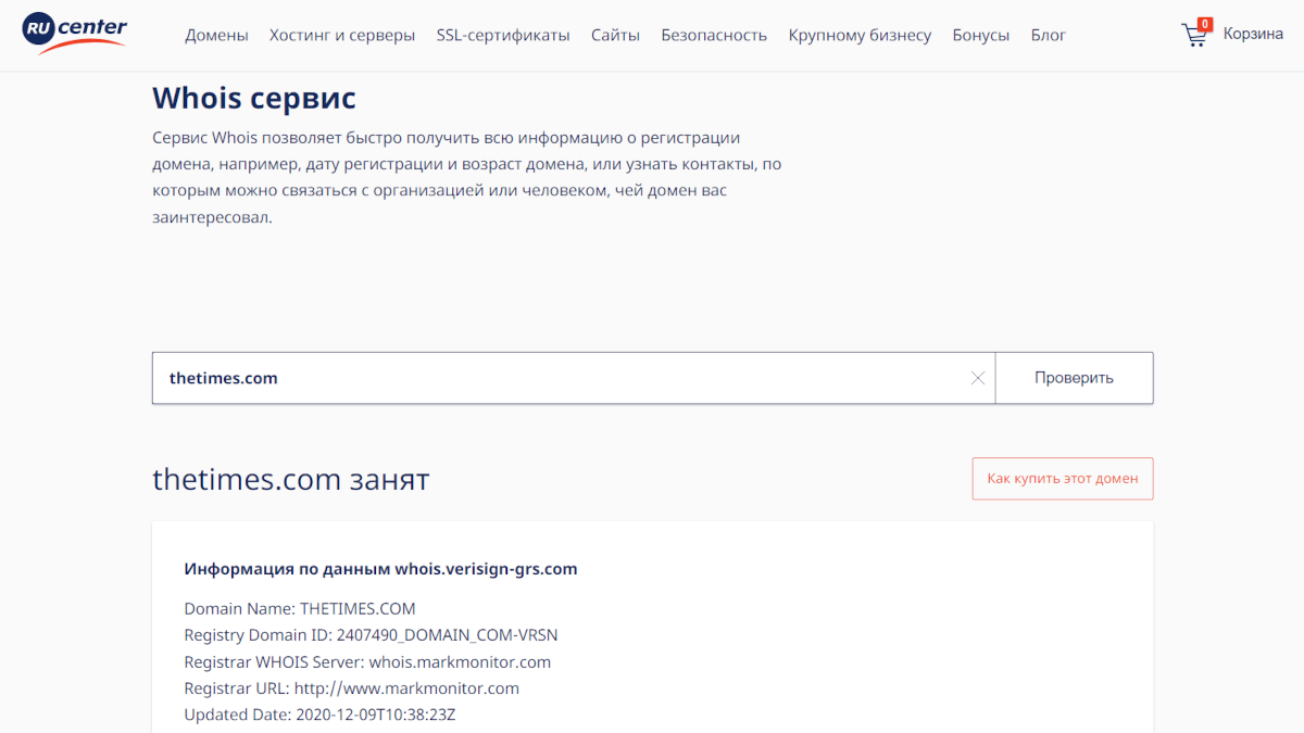 Домен регистрируется и поддерживается компанией-регистратором доменных имен. Таких компаний много. Если у вас есть сайт и домен, значит, этот домен зарегистрирован у подобной компании. Выясните, у какой именно, если не знаете. Сделать это можно в базе WHOIS, например, здесь. Введите свой домен, нажмите кнопку. В строчке «Registrar WHOIS Server» вы увидите название своего регистратора. Обратите внимание: ваша личная информация, такая как имя, физический адрес или номер телефона, в публичный доступ не выкладываются.