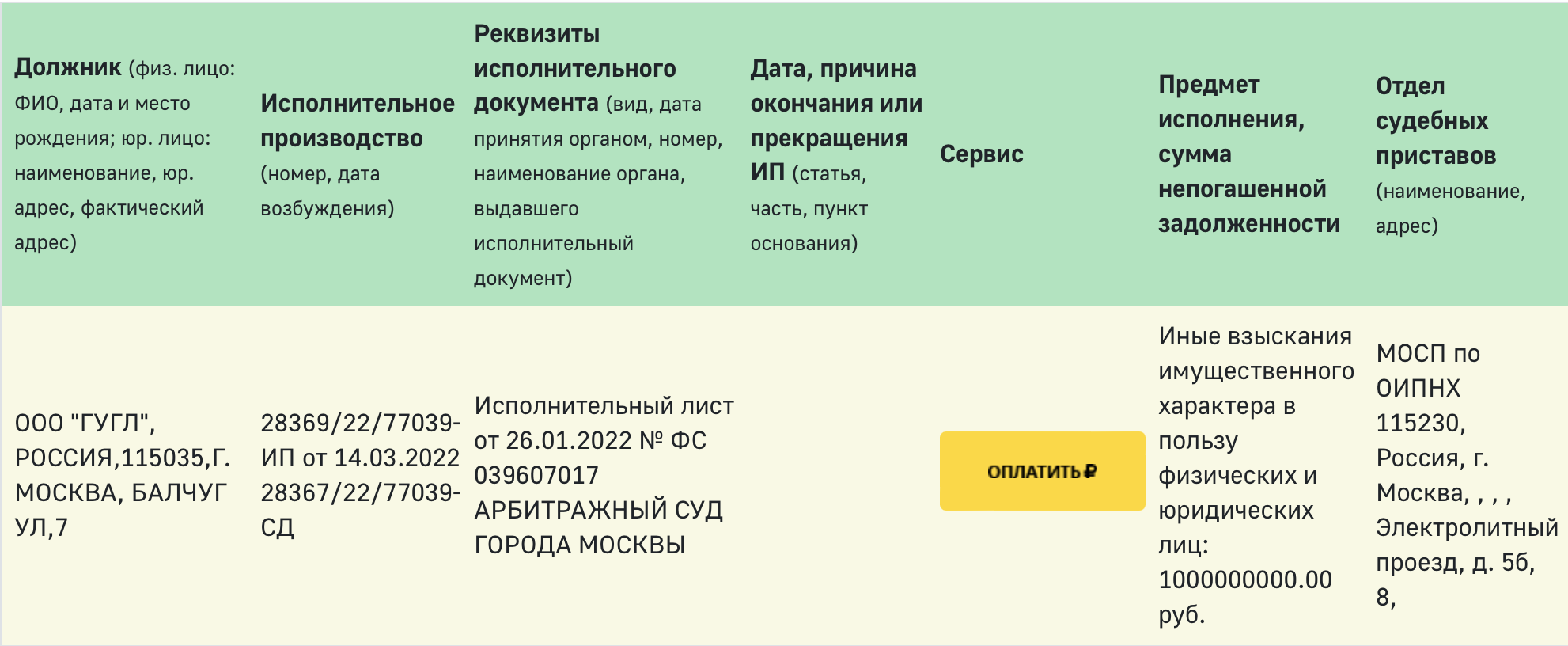 В базе судебных приставов упоминается открытое 14 марта к ООО «Гугл», российской «дочке» компании, на миллиард рублей. Компания, согласно базе Арбитражного суда Москвы, оспаривала блокировку их рублевых счетов приставами, но суд 25 марта отказал ей.