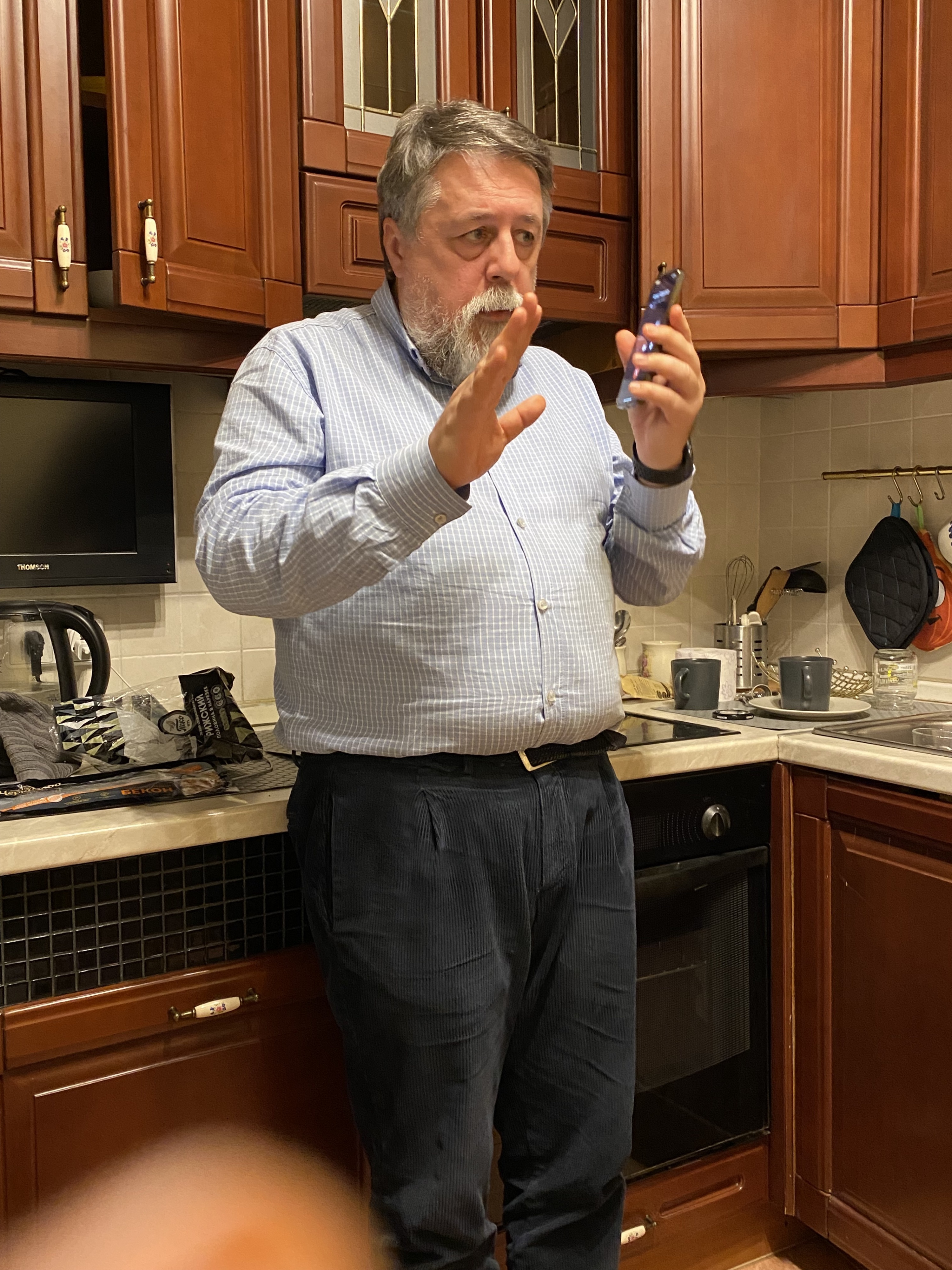 На кухне, вполне советской по размерам, Манский ел нарезанное тонко сало. Еще стояла тарелка со скумбрией, стояла и почти пустая бутылка красного вина. Приходили и уходили какие-то молодые люди, видимо волонтеры, приносили и уносили в большую комнату, где все сидели на полу, пиво и прочее. И все это очень напоминало московскую квартиру семидесятых, где диссиденты собрались обсудить прошедшую акцию. Только не курили, было чище, и не было хреновухи , разведенного спирта из лаборатории, настоянного на чесноке. Но атмосфера, разговоры — ну просто, back в молодость.