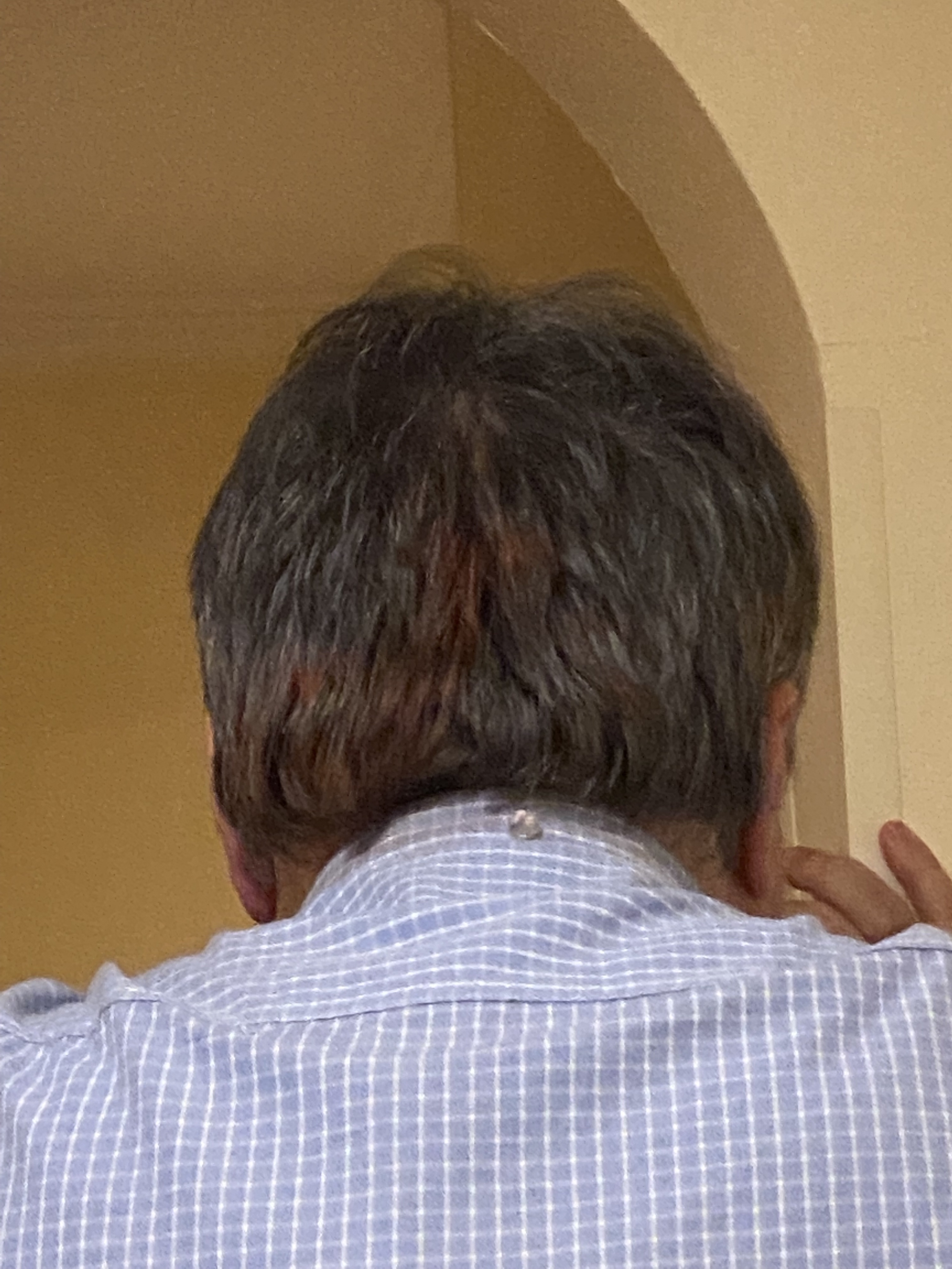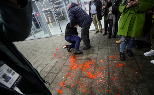 Манский от него уворачивался и не зря. В какой-то момент человек плеснул в него красно-оранжевой краской: примеривался в лицо, но получилось облить куртку и брюки сзади, да и на волосах Манского осталась рыжая краска.