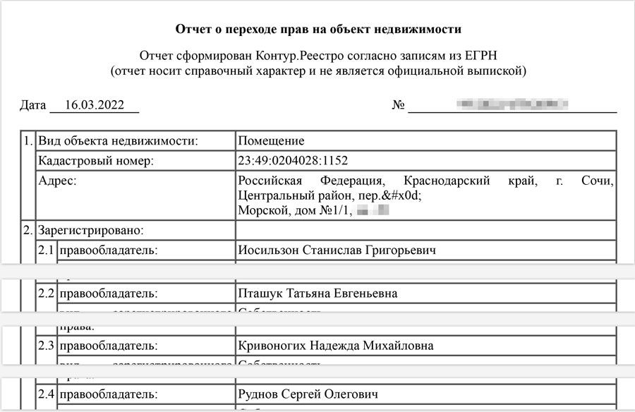 Сначала квартирой владел бизнесмен Станислав Иосильзон — он известен как пострадавший от осужденного на 7 лет бизнесмена Виктора Батурина. От Иосильзона квартиру получила Пташук, которая владела ей до 2020-го, когда недвижимость перешла Надежде Кривоногих. Она — мать той самой любовницы Путина Светланы Кривоногих и бабушка внебрачной дочери президента. Летом 2021 года квартиру получил еще один неслучайный человек — Сергей Руднов, сын друга Путина. Руднова можно назвать «номиналом Путина». Прежде он покупал для президента его родовой дом в Тверской области, на него записывали исторический особняк под Выборгом, где отдыхал Путин, а еще он — совладелец прокремлевской «Комсомольской правды».