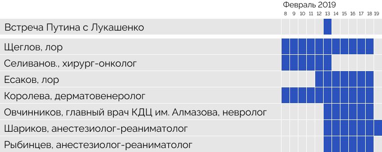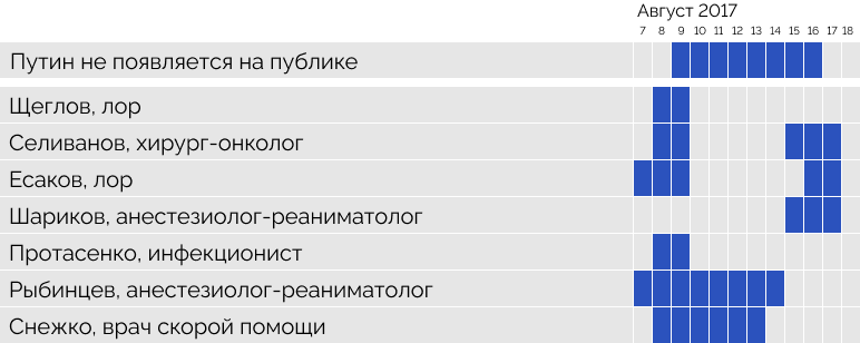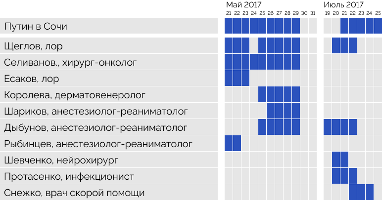 В тот период с президентом работает вполне стандартный набор дежурных специалистов, все они появляются в Сочи одновременно с главой государства. Например, большую часть мая 2017 года врачи сменяли друг друга, но 29 числа того же месяца все как по команде уехали — президент в этот день отбыл сначала в Париж, а оттуда в Петербург. 21 июля президент возвращается в Сочи встречаться с президентом Азербайджана Ильхамом Алиевым — и там его уже ждут все те же лор Щеглов и инфекционист Протасенко, а также штатный реаниматолог Илья Дыбунов, защитивший диссертацию по анестезиологии, и нейрохирург Елена Шевченко — почти все прибыли в Сочи за день до главы государства. На следующий день после переговоров президент, видимо, остается в Сочи на отдых, и к специалистам присоединяется врач скорой помощи Сергей Снежко.