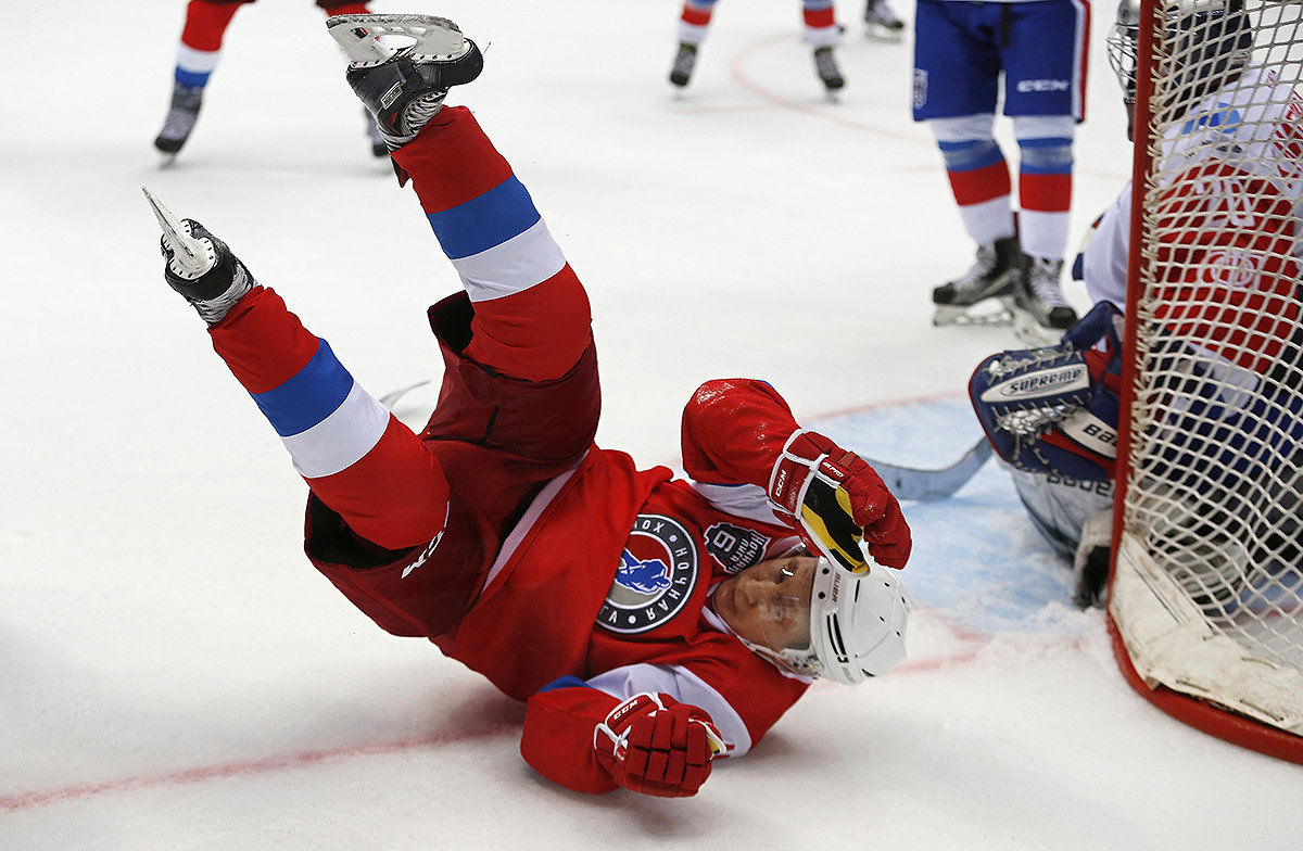 … Значительную часть мая 2017 года Путин провел в своем любимом месте — Сочи. На следующий день после парада Победы он отправился в южную резиденцию «Бочаров ручей» и в тот же вечер, как всегда, блестяще играл в хоккей в сочинском ледовом дворце. Его команда «Легенды хоккея» разгромила соперников со счетом 17:6, а глава государства внес в эту победу решающий вклад, забив семь шайб. Матч омрачился только одним — легендарный ветеран Павел Буре случайно врезался в президента, и тот упал, едва не совершив кульбит.