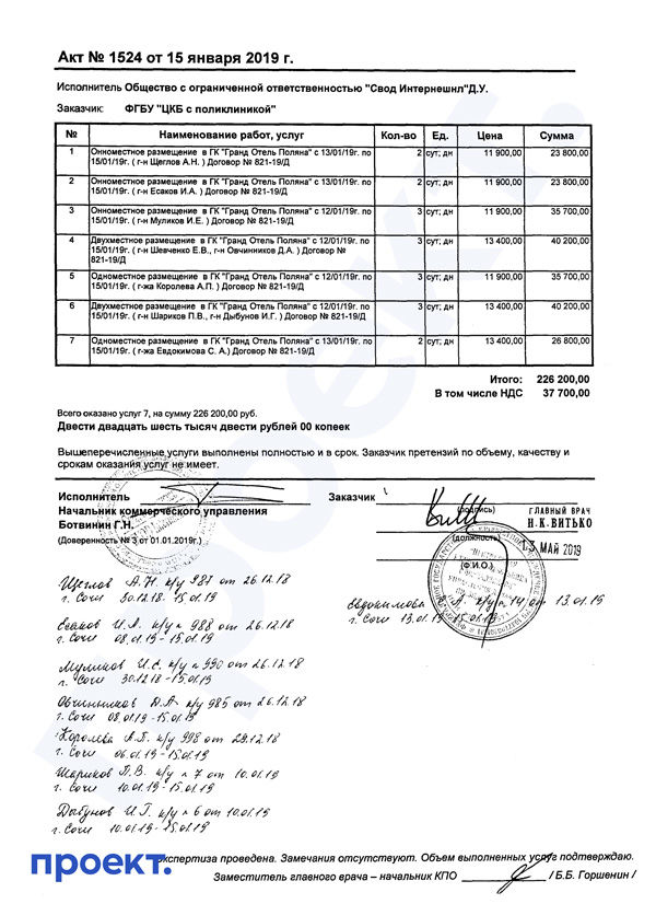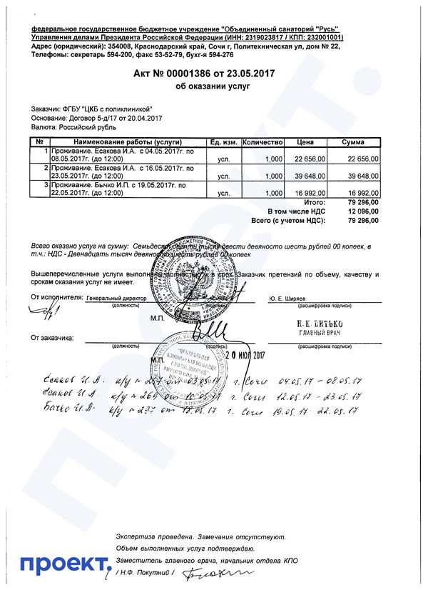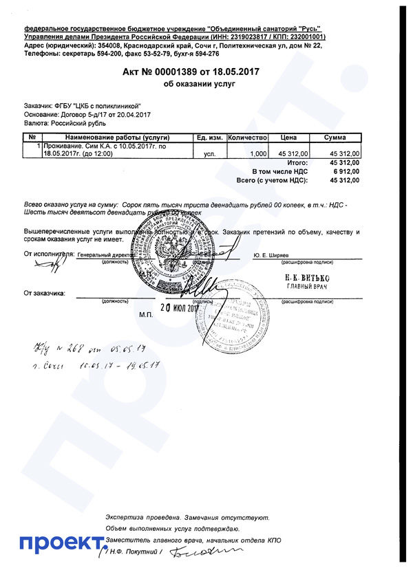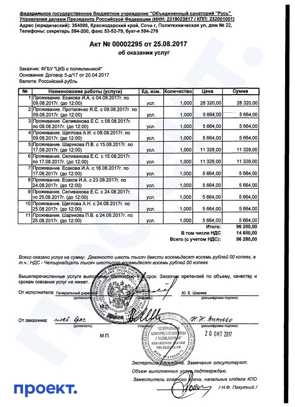Договор между ЦКБ и гостиницами на размещение докторов публикуется на сайте госзакупок вместе с актами приемки оказанных услуг. В актах можно обнаружить имена врачей и даты их заселения в гостиницы за четыре года — с 2016 до 2020 гг. Из этих документов ясно, что медики, такие как Сим, летали именно к Путину — даты совпадают либо со временем официальных визитов президента в Сочи, либо с периодами его таинственных исчезновений.