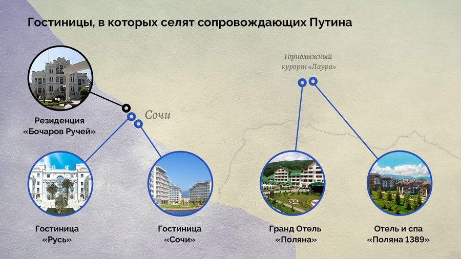 Парадоксально, но, много лет скрывая информацию о здоровье Путина, власти выложили в открытый доступ сведения о врачах президента. Дело в том, что всех сопровождающих Путина в Сочи, в том числе докторов, селят в четырех местах — рядом с горнолыжным курортом «Лаура», в гостиницах «Гранд Отель Поляна» и «Поляна 1389 Отель и Спа» они принадлежат «Газпрому», либо недалеко от его резиденции в уже упомянутой «Руси» и санатории «Сочи» , которые входят в управление делами президента.