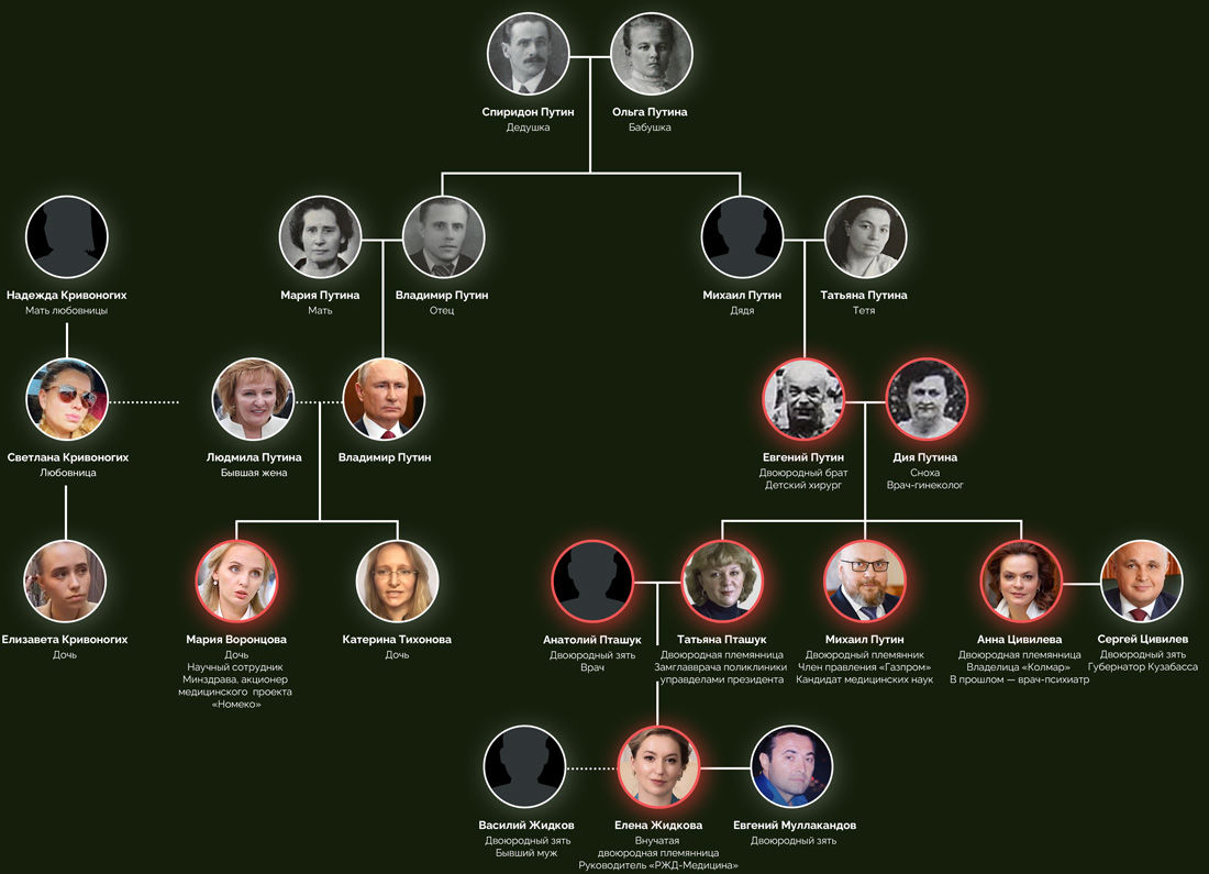 Но у Путина есть и другие близкие люди в этой сфере, в том числе до сих пор неизвестные. Двоюродный брат президента Евгений Путин всю жизнь проработал детским хирургом, его супруга Дия — гинекологом , следует из открытых данных и рассказов их соседей, а все трое их детей выучились на психиатров. Правда, по профессии работают не все, предпочтя ей карьеру по блату — Михаил получил пост зампреда «Газпрома», а Анна вместе с супругом Сергеем Цивилевым забрала в управление сначала угольную компанию «Колмар», а потом целую Кемеровскую область.