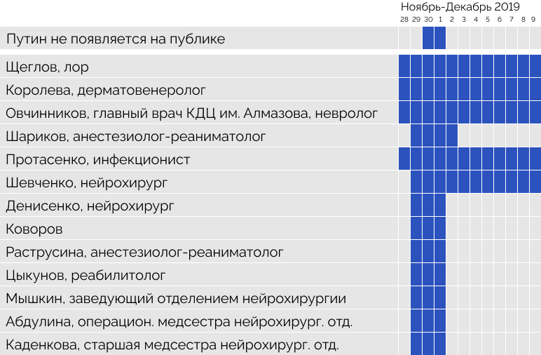 В 2019 году Путину снова потребовалась помощь. В выходные дни 30 ноября и 1 декабря президент находился в Сочи , по крайней мере, 29 ноября он проводил рабочие мероприятия в Нальчике, а уже 2 декабря заседал в Сочи, но на публике не появлялся, и в этот момент к нему приехало рекордное количество медиков — сразу 13 человек, включая все тех же специалистов отделения нейрохирургии ЦКБ во главе с Мышкиным. К ним добавились специалист по травмам позвоночника Елена Денисенко и операционная медсестра Гульфия Абдулина.