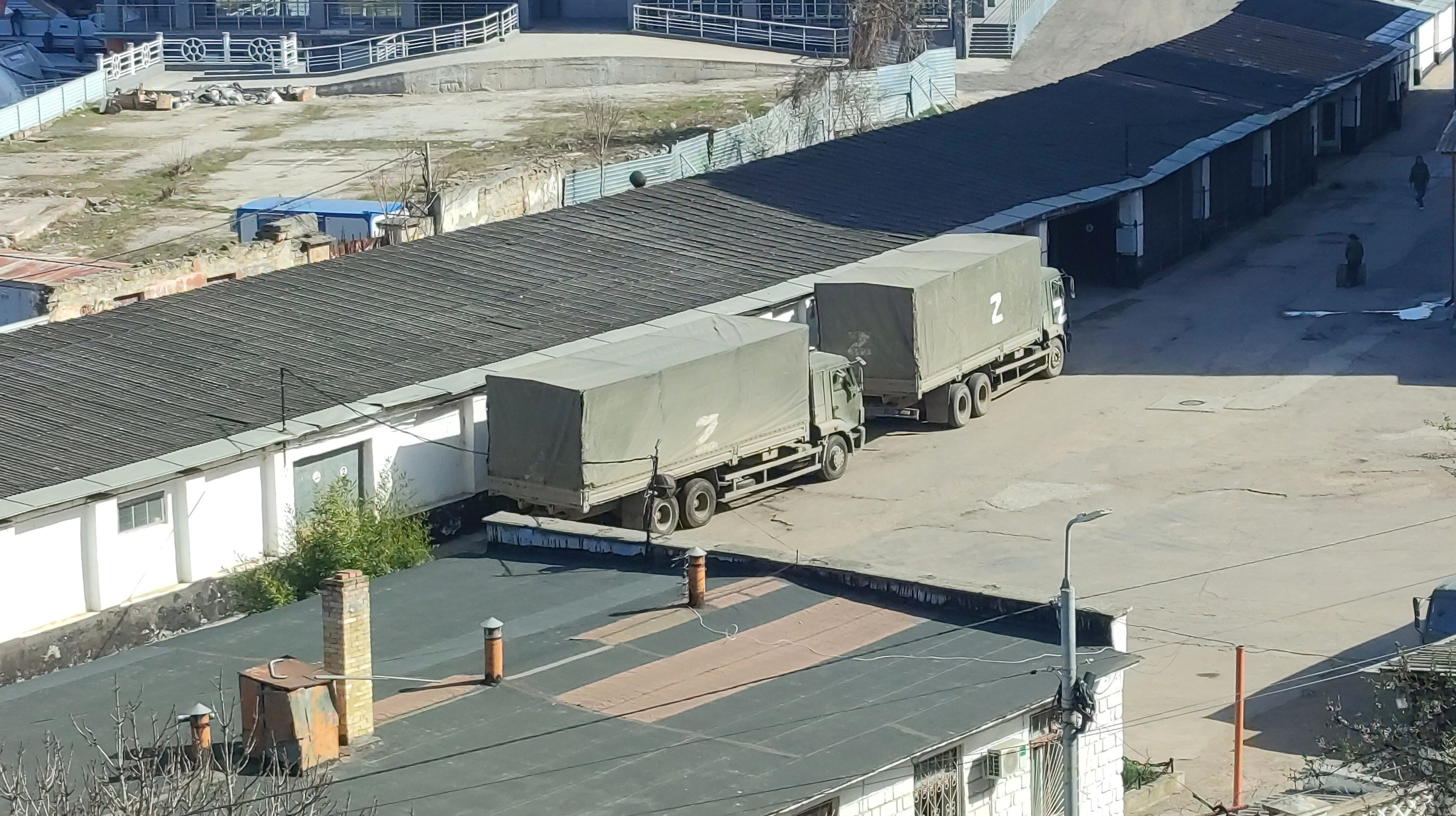 В Севастополе загружаются продовольствием военные грузовые автомобили «Камаз» с символикой «Z» на кабине и на тенте кузова. Об этом сообщает корреспондент Крым.Реалии.
