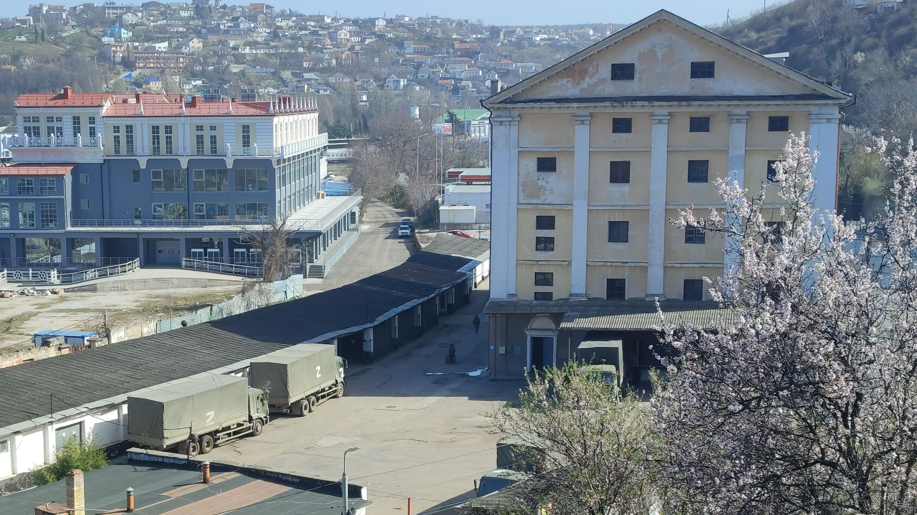 Загрузка происходит на продовольственных складах Черноморского флота России, которые находятся у оконечности Южной бухты по адресу Троллейбусный спуск, 15.