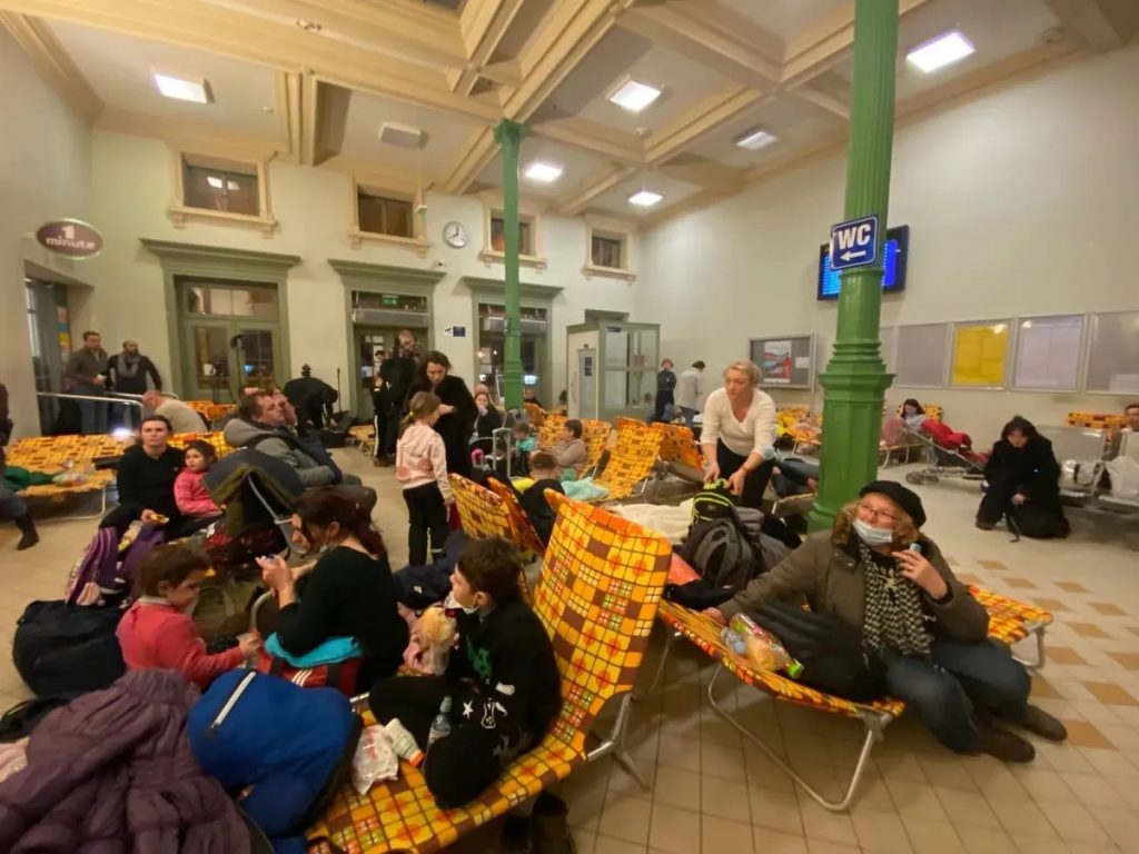 Беженцев собирают на железнодорожной станции. Это один из девяти приграничных пунктов приема беженцев. Своды станции, под ними — люди, ярко-оранжевые раскладушки. Горы воды и булок с повидлом, украиноговорящие волонтеры. Бесплатные трансферы в города Польши.