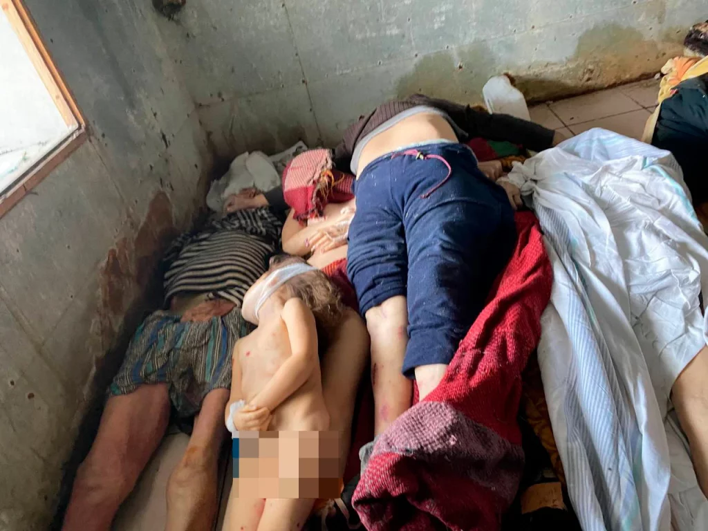 Голые ноги, кто-то обут. Обгоревший парень лежит с разведенными руками, спекшийся черный ком вместо лица. Половина тела человека, мясо перемешано с травой, голова прикрыта курткой, из-под куртки выглядывает мужская рука. Голый мужчина, завернутый в цветастую простыню. Российский солдат – руки закинуты за голову, камуфляж задрался, выглядывает чистая тельняшка, желтая полоска живота.