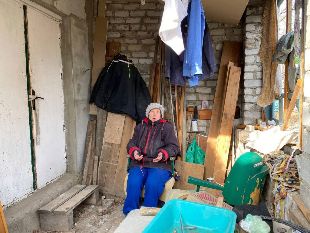 — Вот тут я села. Вот тут я сидела. И сижу вот так, никакого звука нет. Никакого звука нет, чтоб я испугалась. Два самолёта таких страшных черных, темно-серых, а я даже не двинулась с места. Думаю, они же по населению не стреляют. И тут же оно по потолку начало... Это такой ужас… Посмотрите на ворота, какие дырки. Если бы успели меня стрельнуть. Я в таком шоке, что я не могу отойти. Вы знаете, я боюсь. Потому, что уезжать тоже страшно. Это надо доехать. Я смотрела новости, семья уезжала. Попали под обстрел. И дети погибли, и родители.