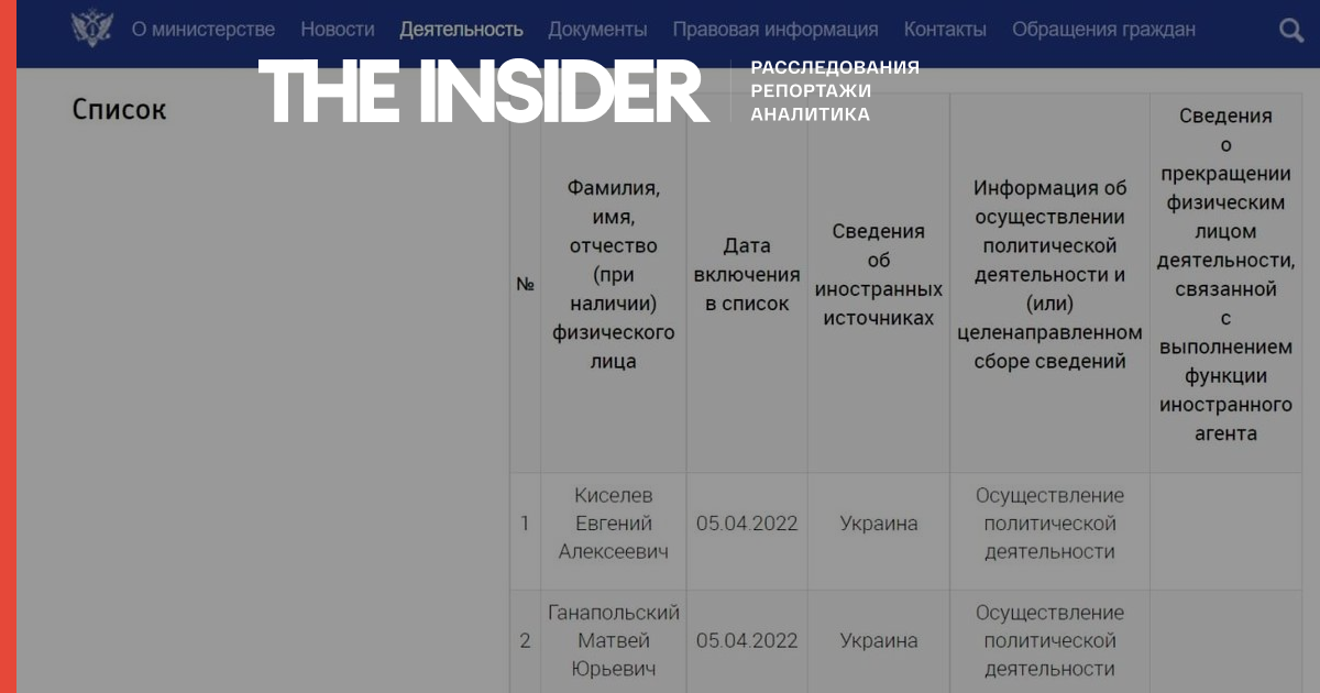 Министерство юстиции РФ создало единый реестр физических лиц, которые объявлены «иностранными агентами» или которые связаны с ними. В список уже попали журналисты Матвей Ганапольский и Евгений Киселев.