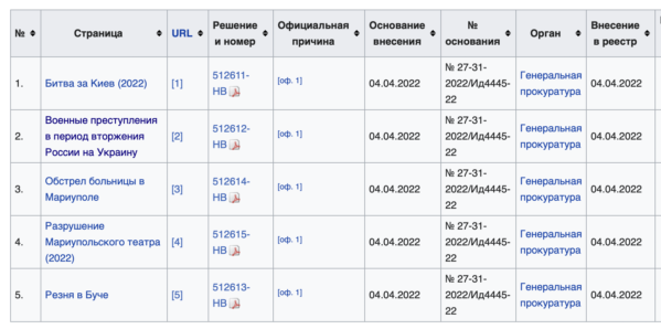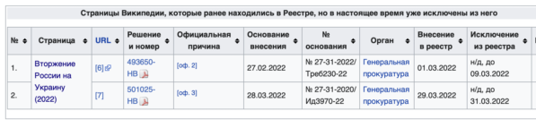 * * *Это не первые претензии к «Википедии» во время конфликта России с Украиной: 1 марта представители ресурса сообщили об уведомлении Роскомнадзора и угрозе блокировкой из-за статьи «Вторжение России на Украину (2022)». На сайте указано, что на момент написания этой заметки статья исключена из реестра.
