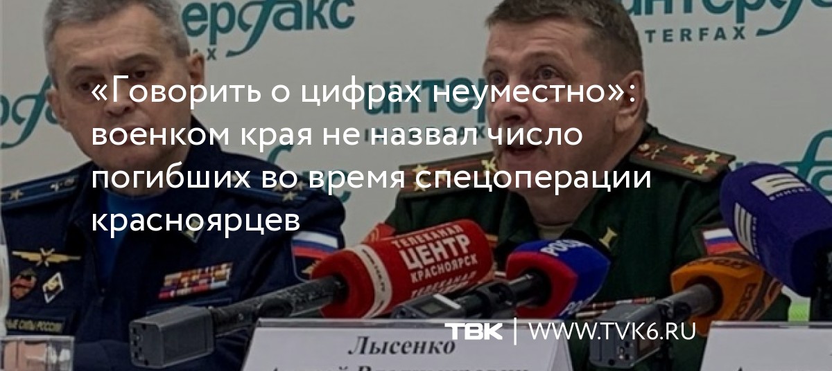 «Это трагедия не только для родителей, это трагедия для всех нас. И это моя личная трагедия, потому что я лично их отправлял в армию, я чувствую за них ответственность. Поэтому цифр, сколько у нас погибло, сколько красноярцев ранено... Мы не ведём такую статистику. Я считаю, что это в какой-то мере пошло. Мы с кем-то будем сравнивать, что ли? С соседними субъектами будем сравнивать: сколько у вас, а сколько у нас? Любой гражданин нашему государству дорог. Я считаю, что о цифрах говорить просто неуместно», – ответил военный комиссар Красноярского края Андрей Лысенко.