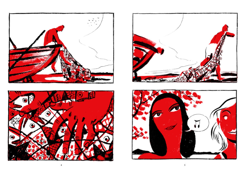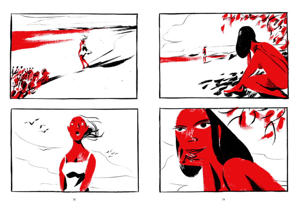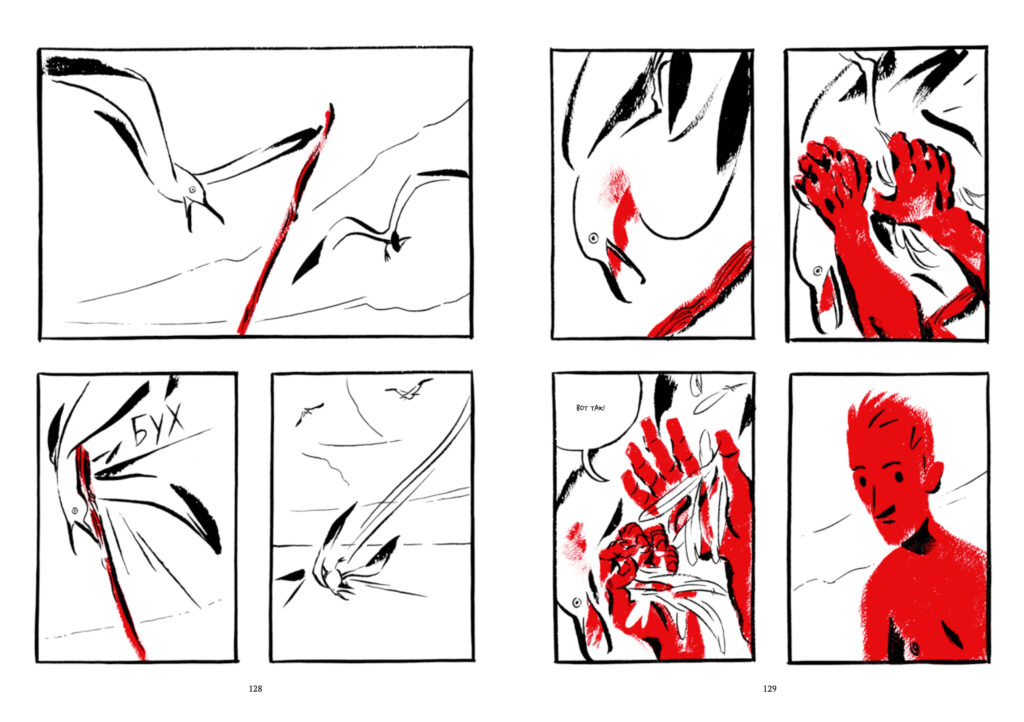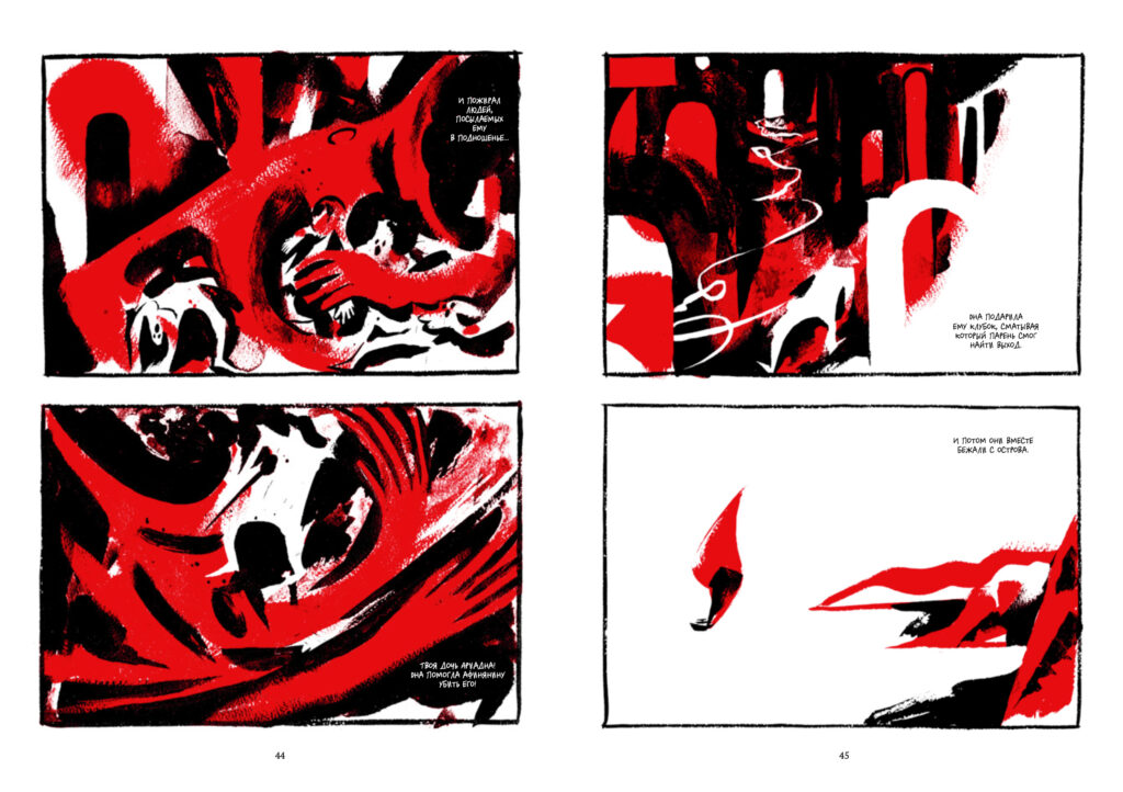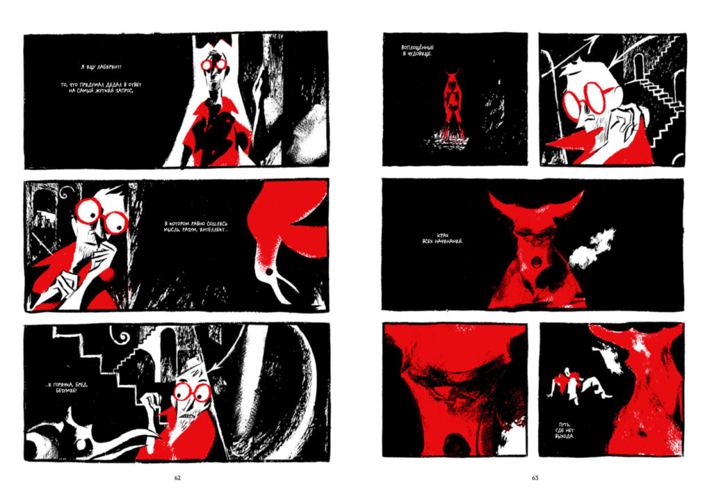 Совсем другое дело — визуальная составляющая поэмы. В «Икаре» Фьор ограничивает себя минималистичной палитрой, используя только черный, белый и красный и извлекая из них максимум выразительности. Подобные ограничения редко приносят ценные плоды, скажем, в прозе или поэзии, но визуально-нарративные искусства они лишь облагораживают.
