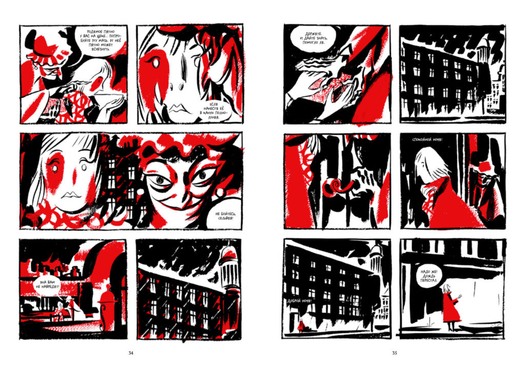 В целом же энергичная рисовка подкрепляет все ту же грубую нежность: Фьор непрерывно сталкивает жесткие и мягкие линии, цветовые поля и орнамент, жестокую карикатурность и легкую интимность. Именно на визуальном уровне художник по-настоящему реализует сюрреалистическое (в самом подлинном смысле слова) начало своего творения, вынуждая невольно вспоминать о киноклассике жанра в разбросе от «Орфической трилогии» Кокто до линчевского «Малхолланд-драйв». Это впечатление подкрепляет организация повествования, построенного по принципу ленты Мебиуса — прием затасканный, но все равно весьма эффектный при умелом обращении; его неуютную притягательность читатель, поверьте, заметит с первых же страниц.
