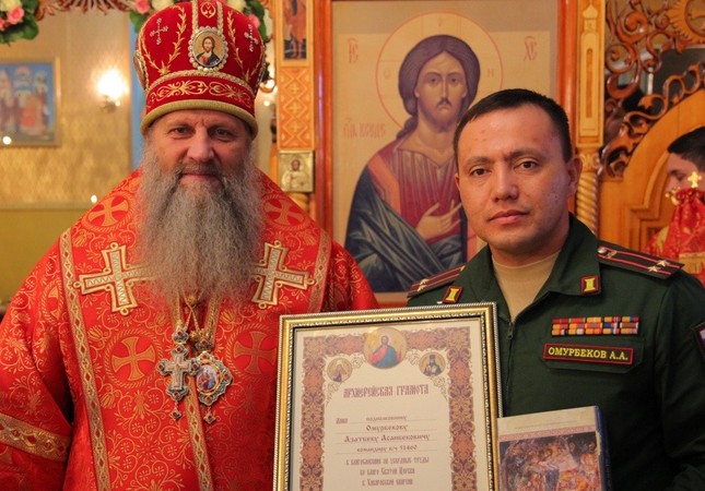 В 2014 году замминистра обороны Дмитрий Булгаков наградил Омурбекова медалью "За выдающиеся заслуги". В ноябре прошлого года епископ Хабаровский и Приамурский Артемий наградил Омурбекова архиерейской грамотой. После службы офицер заявил: "Наша история показывает, что все сражения мы брали преимущественно своим духом. Оружие не являлось здесь самым главным. Храм - это то место, где мы можем причаститься и подготовиться к предстоящим действиям. Благодаря Всевышнему мы добивались тех высот, которых достигли".