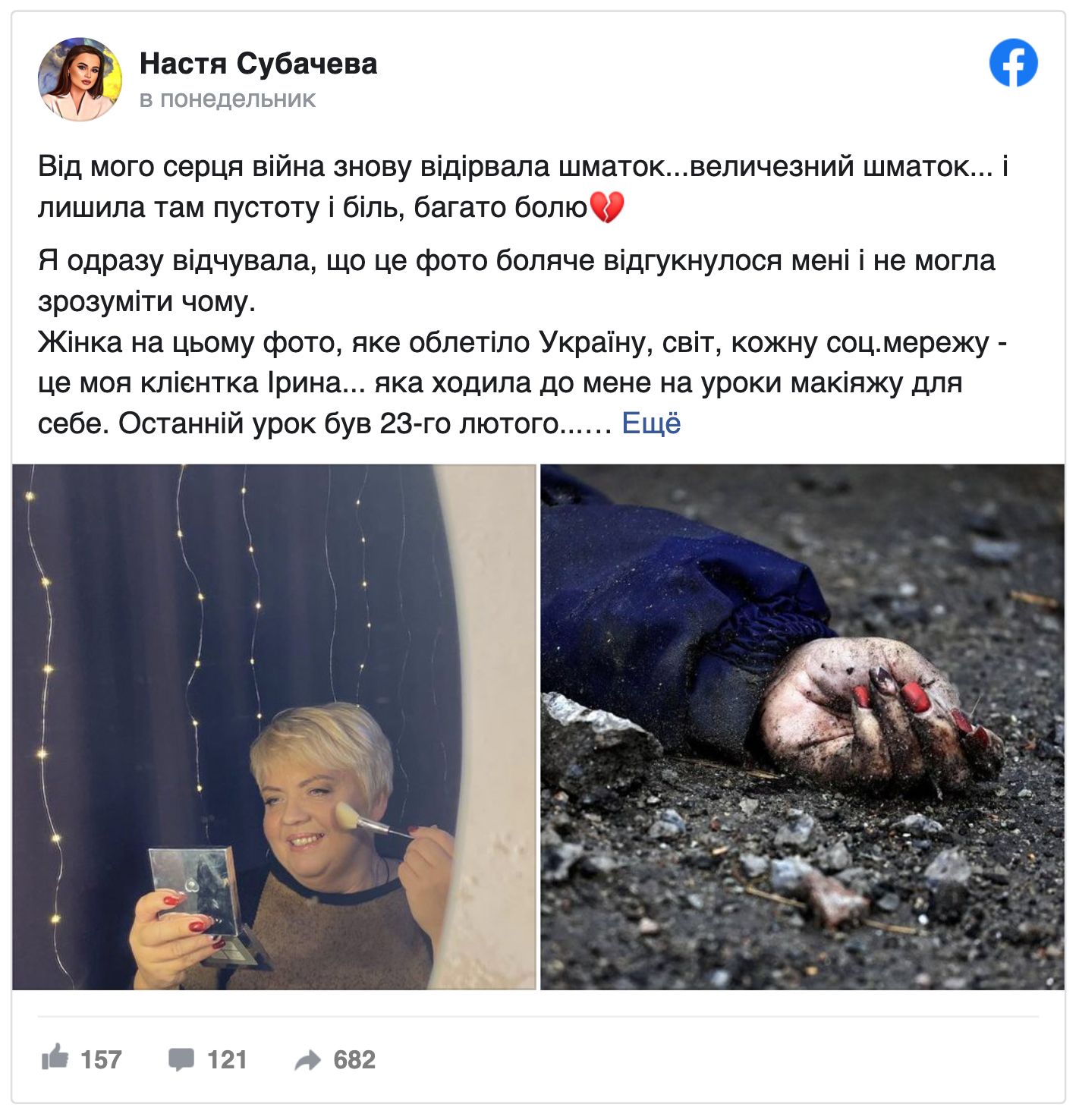 Погибшей оказалась 52-летняя жительница города Ирина Филькина. Ее узнала визажистка из Гостомеля Анастасия Субачева, у которой Ирина брала уроки до начала войны. Об этом девушка рассказала в своих соцсетях и в интервью газете The New York Times.
