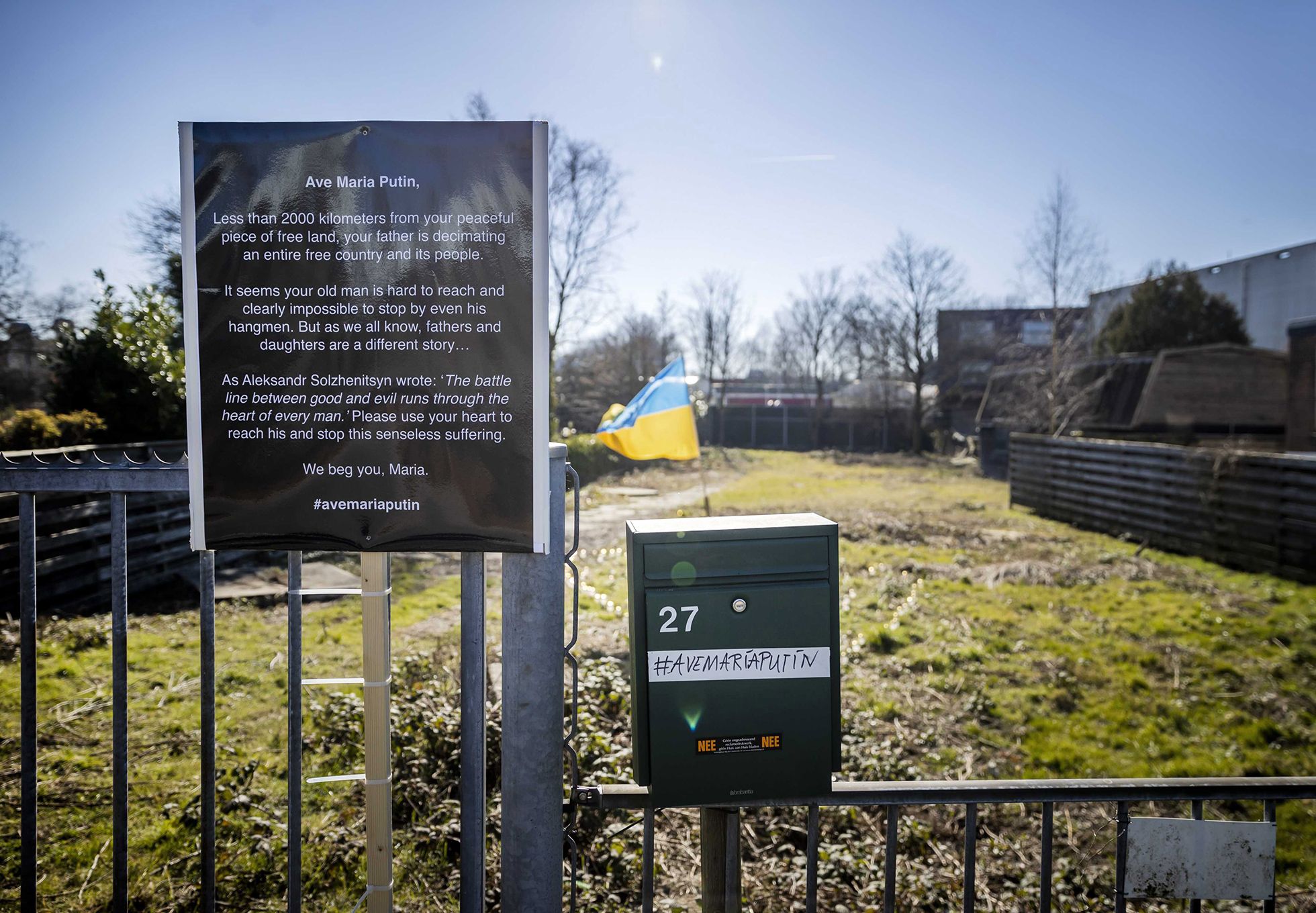 В начале марта неизвестные установили украинский флаг перед забором пустующего участка площадью в два теннисных корта в пригороде Амстердама Дювендрехте. Еще один флаг появился прямо на участке. А на почтовый ящик возле калитки прилепили наклейку с хештегом #AveMariaPutin («Приветствуем, Мария Путина»).