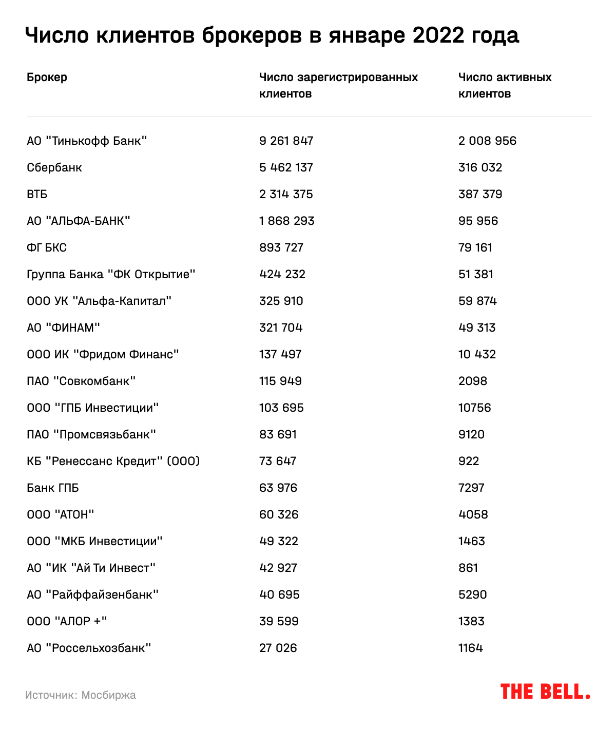 Как изменился топ крупнейших брокеров после всех этих потрясений — точно неизвестно. Ранее Мосбиржа ежемесячно публиковала данные о числе зарегистрированных и активных клиентов брокеров. С февраля они больше не раскрываются.