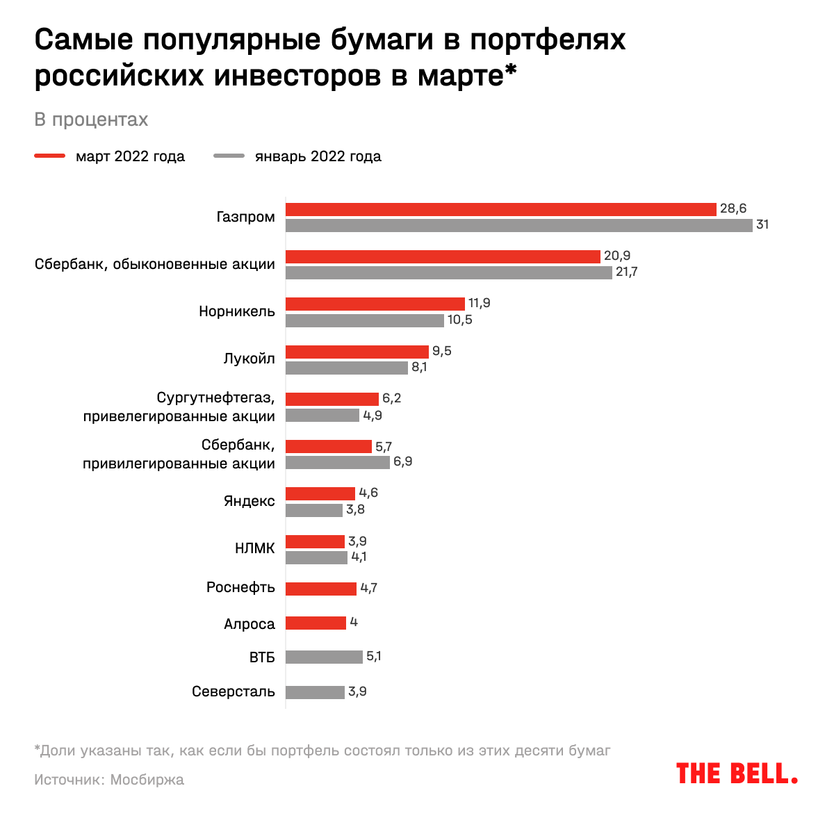 Предпочтения инвесторов по российским акциям изменились не сильно. Из топ-10 в марте выбыли только ВТБ и «Северсталь», их место заняли «Роснефть» и «Алроса».