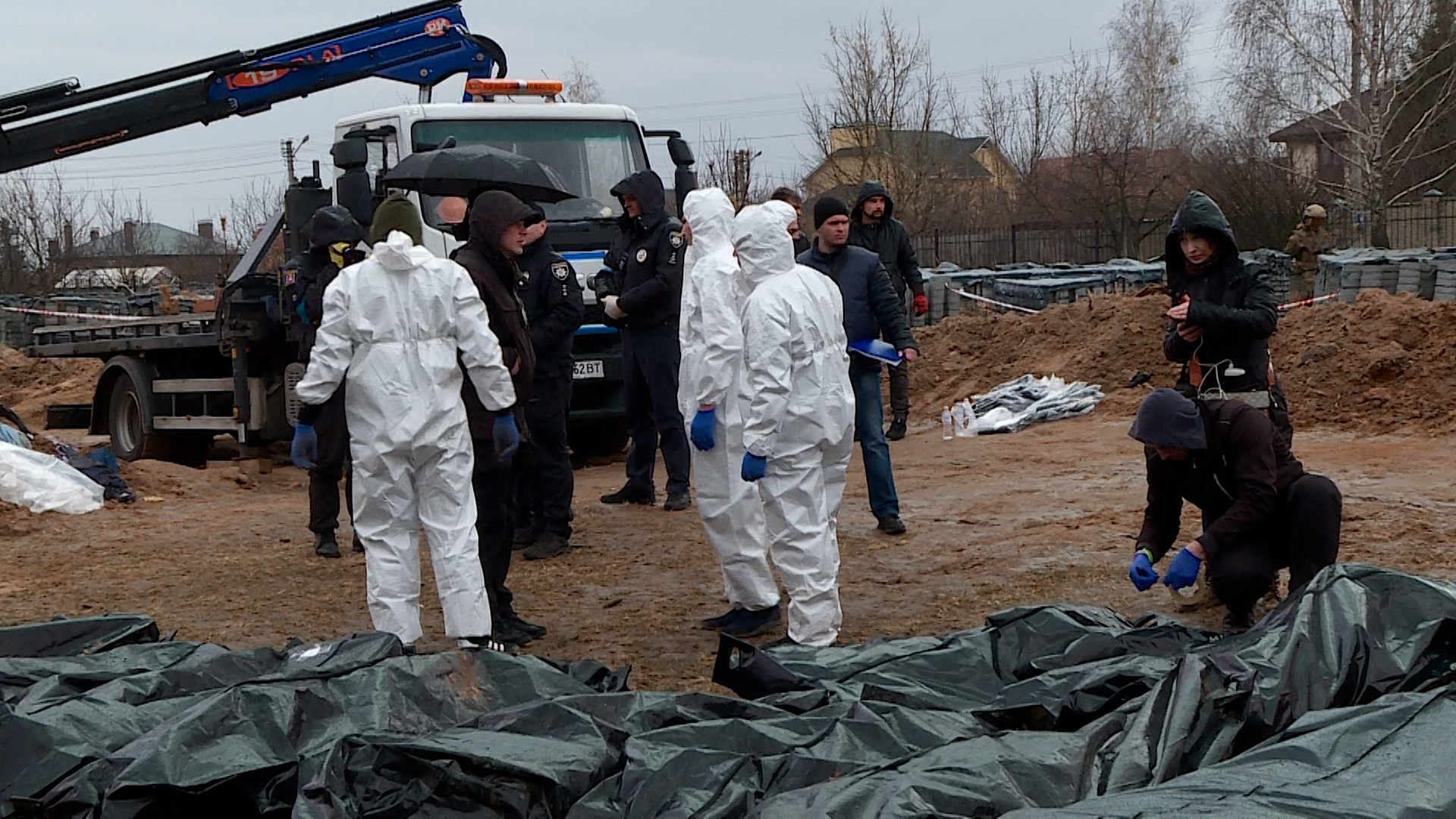 Эксгумация началась 8 апреля. Ее цель – установить личности убитых и причину их гибели. Всего в братской могиле, по предварительной оценке, похоронены 67 человек, сообщалось, что накануне были эксгумированы тела 18. У большинства из них огнестрельные ранения, что, по мнению украинских властей, доказывает, что они были убиты российскими военными, а не погибли при обстрелах (тогда ранения были бы осколочными).