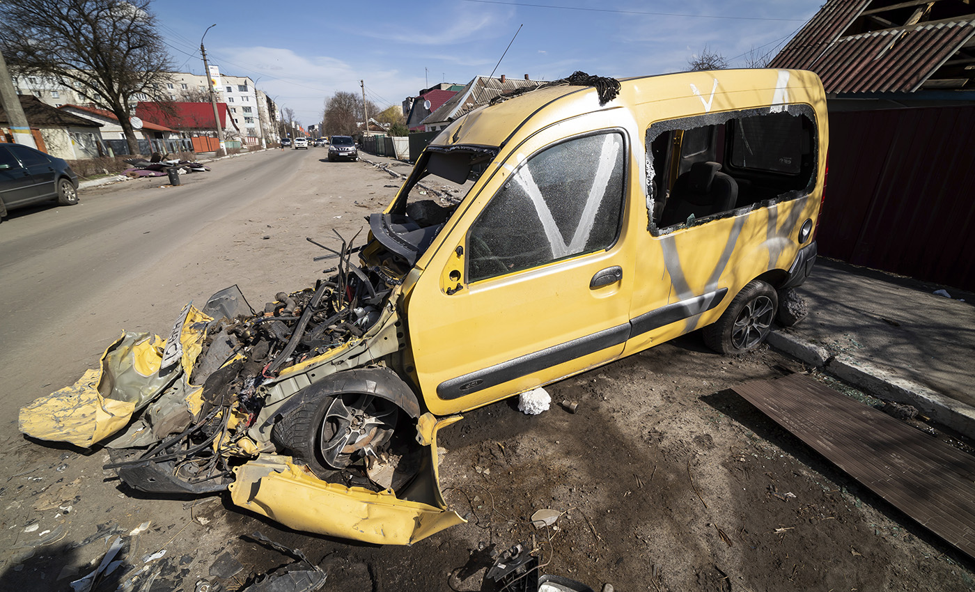 Раздавленный танком и помеченный российской армией автомобиль в Бородянке, 7 апреля 2022 года. Фото: Maca Vojtech Darvik / AP