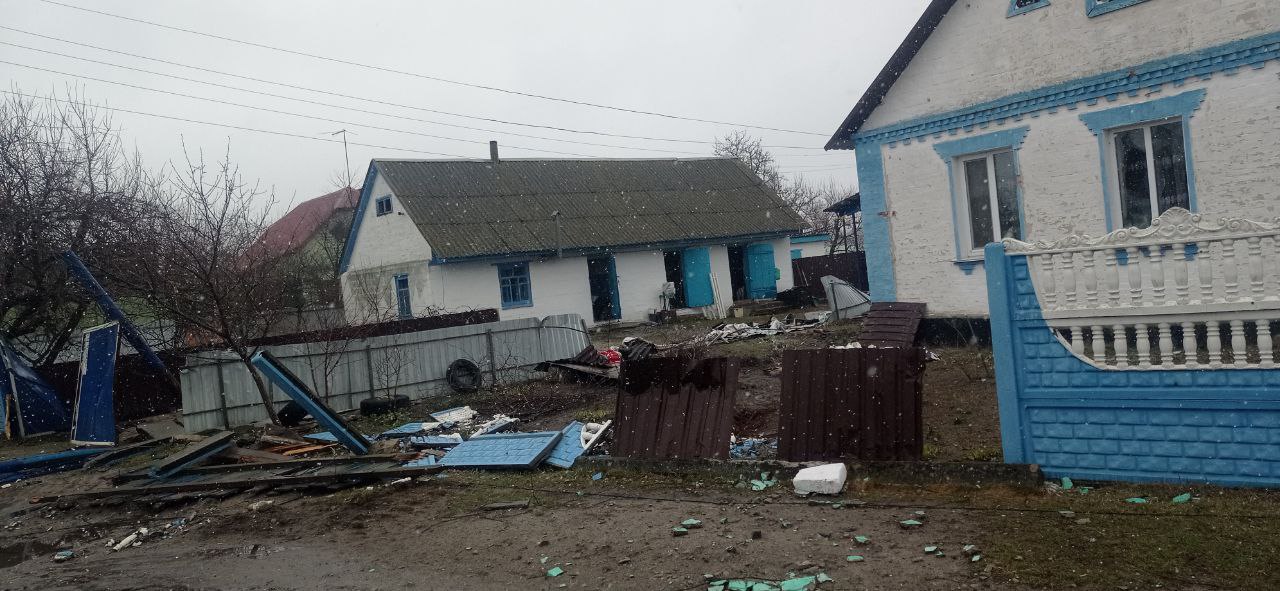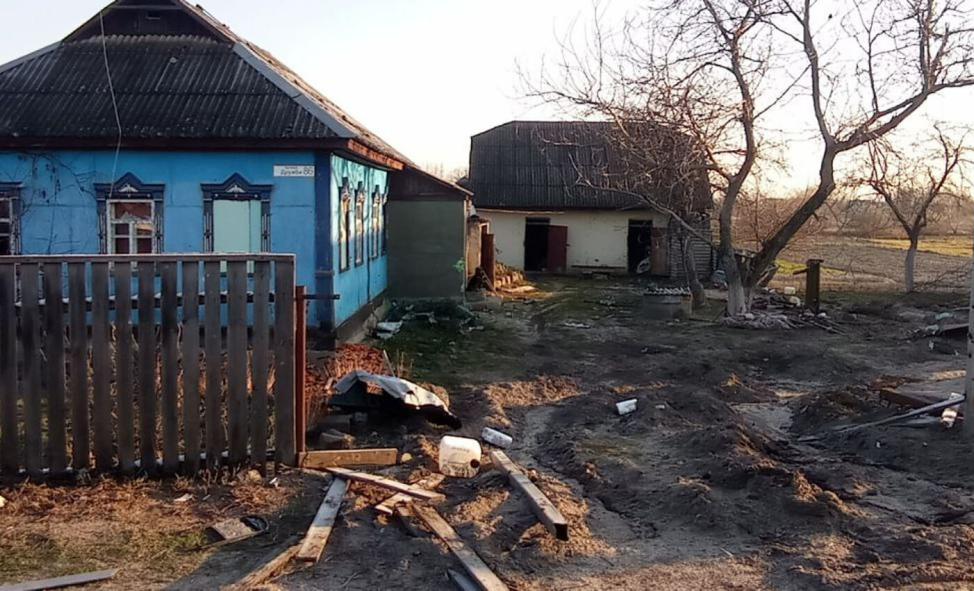 Больше всего разрушений в поселке — на главной улице Тараса Шевченко, продолжает Роман: танки давили заборы, двери в домах вскрыты, вся техника вынесена, на фасадах и автомобилях — баллончиком с краской выведенная буква V.