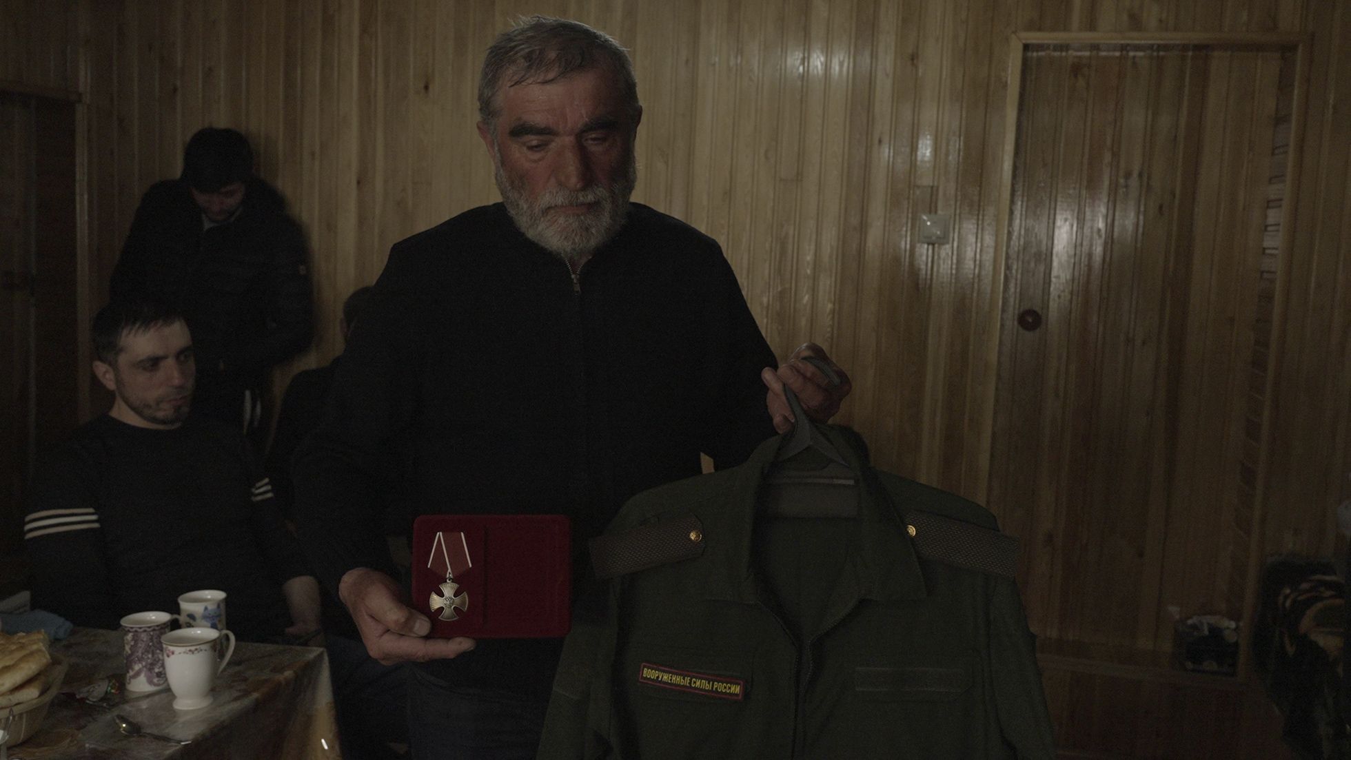 Во время долгого сбивчивого рассказа женщин дверь несколько раз хлопает. Когда возвращается тишина, весь дом уже наполнен молчаливыми мужчинами. Седобородый дед медленно, одну за другой достает почетные грамоты погибшего солдата — за футбол, за легкую атлетику, за участие младшеклассника в жизни лагеря «Солнышко»… В протянутой загрубевшей ладони звенят многочисленные спортивные медали. Наконец мужчины вносят последние реликвии — военную форму и орден Мужества, серебряный крест в красной коробочке. За какой подвиг погибшему дали награду, никто объяснить не смог.