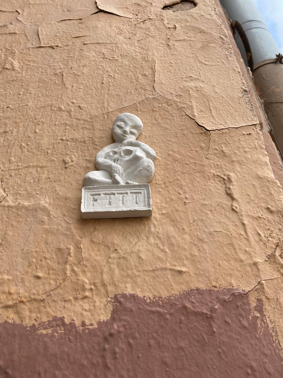 На стене дома в центре Петербурга заметили микроскульптуры в форме младенца, обнимающего череп. Их обнаружили участники Клуба друзей «Бумаги».