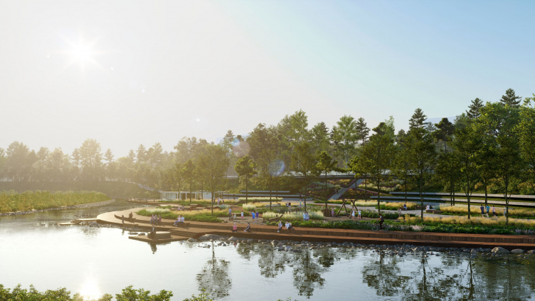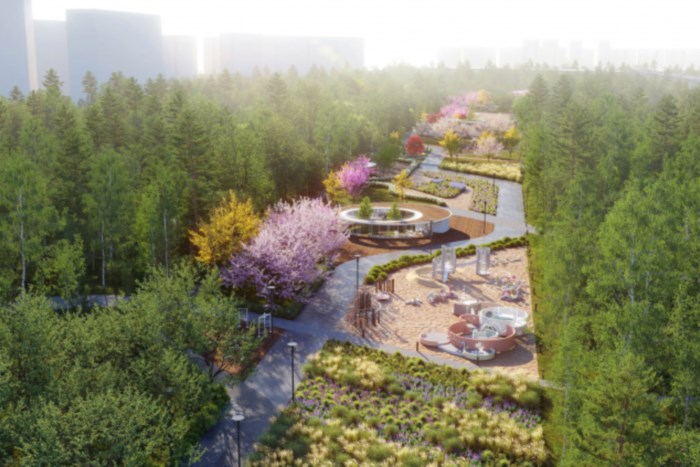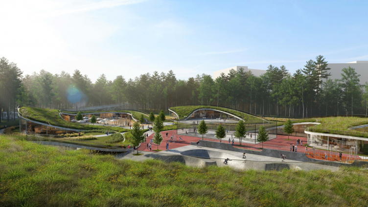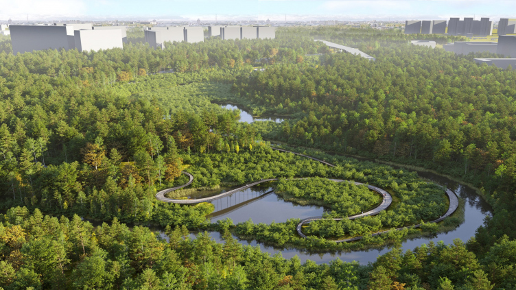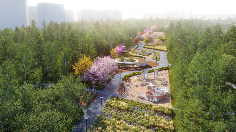 Архитекторы предложили создать на участке площадью 52 гектара многофункциональное пространство с сохранением природной экосистемы. Для этого команда бюро предлагает разместить все рукотворные площадки на месте заросшей дороги, бывшей свалки и на естественных полянах.