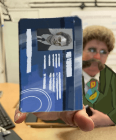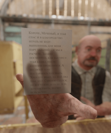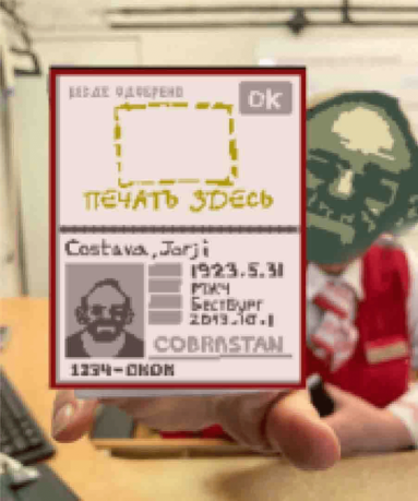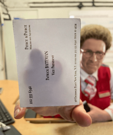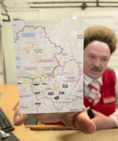Через окно приёма документов Лукашенко показывает, «откуда в страну готовилось нападение», а Патрик Бейтман передаёт свою визитку.