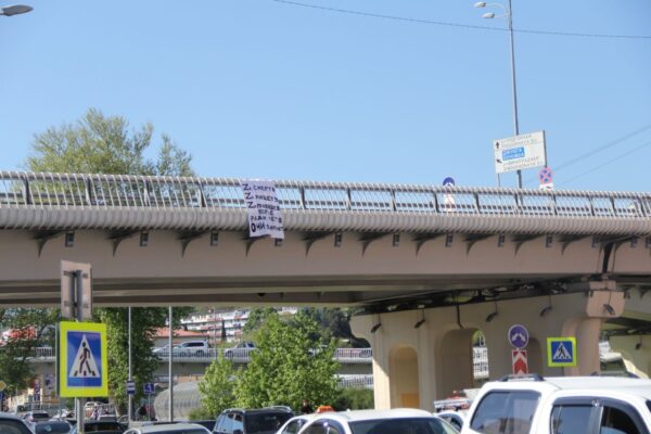 Антивоенный баннер появился сегодня на эстакаде над автомобильной дорогой в Сочи.