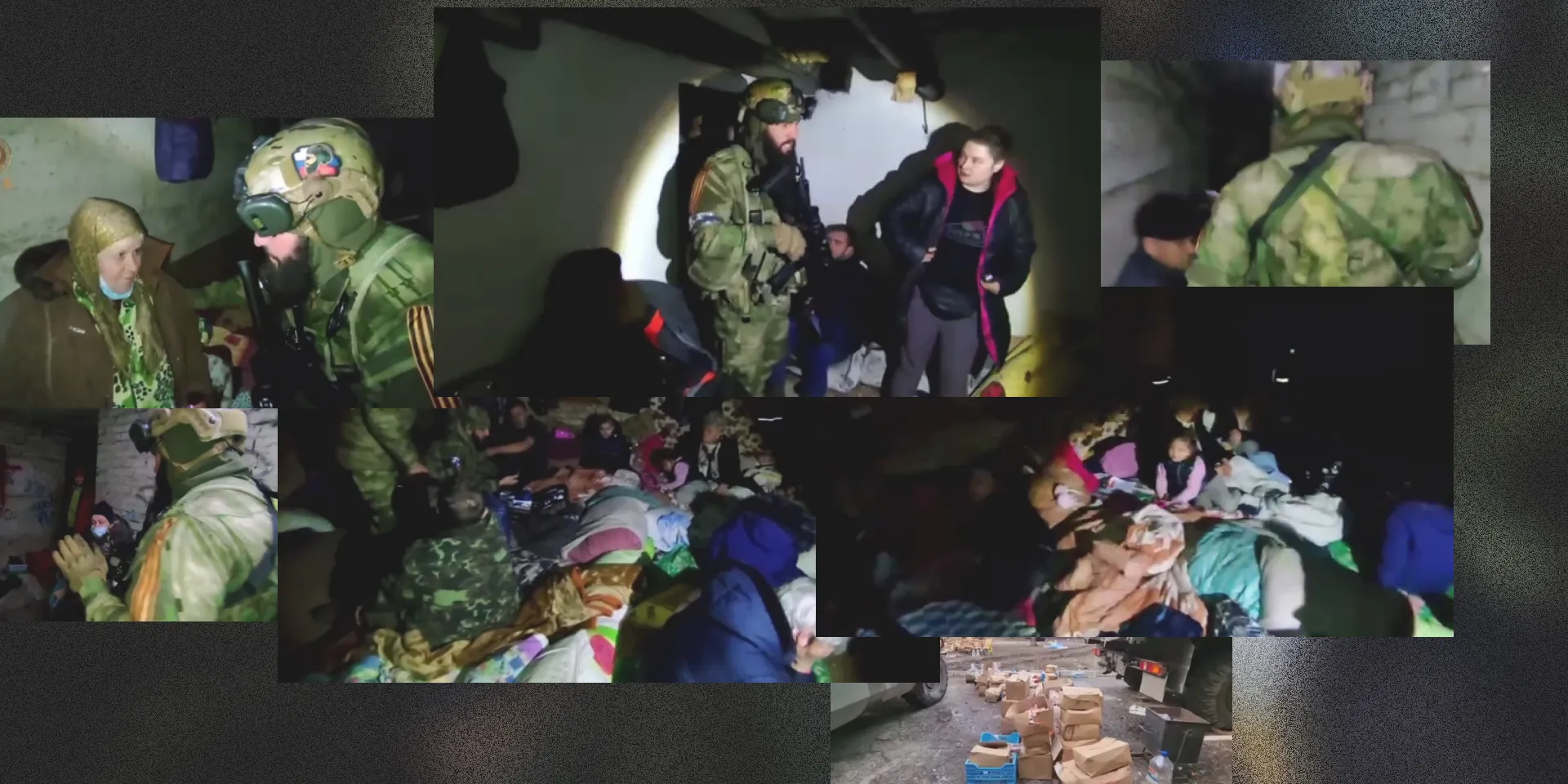Чеченский военный в полной экипировке, с оружием, заходит в подвал, где спасаются от налетов украинские мирные жители. «Лично глава Чеченской Республики Рамзан Ахматович Кадыров сказал, чтобы вас обеспечивали, охраняли, — сообщает он на камеру и уточняет. — Вот из-за этого я и приехал сюда». «Нам сказал Рамзан Ахматович Кадыров, чтобы вас обеспечивали полностью и мы вас охраняли», — обращается военный к пожилой украинке. «Ну конечно, кто еще нас будет охранять? Спасибо, дай вам бог здоровья!» — не без скрытой иронии отвечает она. «Спасибо, Рамзан Ахматович, за то, что хорошо к нам обращаетесь!» — кричат в камеру из подвала украинские дети.