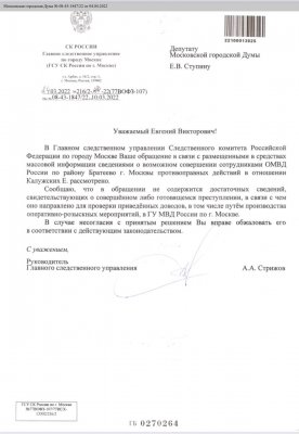Депутат опубликовал свои обращения в Прокуратуру и Следственный комитет по поводу публикаций новостей и аудиозаписи, свидетельствующих о пытках в отношении Александры Калужских, задержанной на антивоенной акции 6 марта. В своем ответе Ступину СК указал, что предоставленных материалов недостаточно для возбуждения уголовного дела.