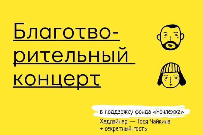 В субботу, 16 апреля, в киноконцертном зале Института кино и телевидения на Бухарестской, 16 пройдет концерт в поддержку благотворительного фонда «Ночлежка». Хедлайнером мероприятия станет Тося Чайкина. Певица уже сделала анонс об этом событии в своей группе во «ВКонтакте». Билеты на концерт стоят 300 рублей. Выручка пойдет на помощь «Ночлежке».