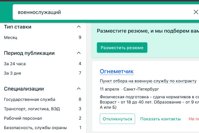 «Бумага» обнаружила на сайте SuperJob 43 вакансии по специальности «Военнослужащий по контракту» в Петербурге и ближайших городах. Среди них — вакансии наводчика-оператора, огнеметчика, командира отделения и старшего разведчика. Еще 30 похожих вакансий разместили на сайте HeadHunter. Некоторые объявления размещены от аккаунтов, названных номерами воинских частей.