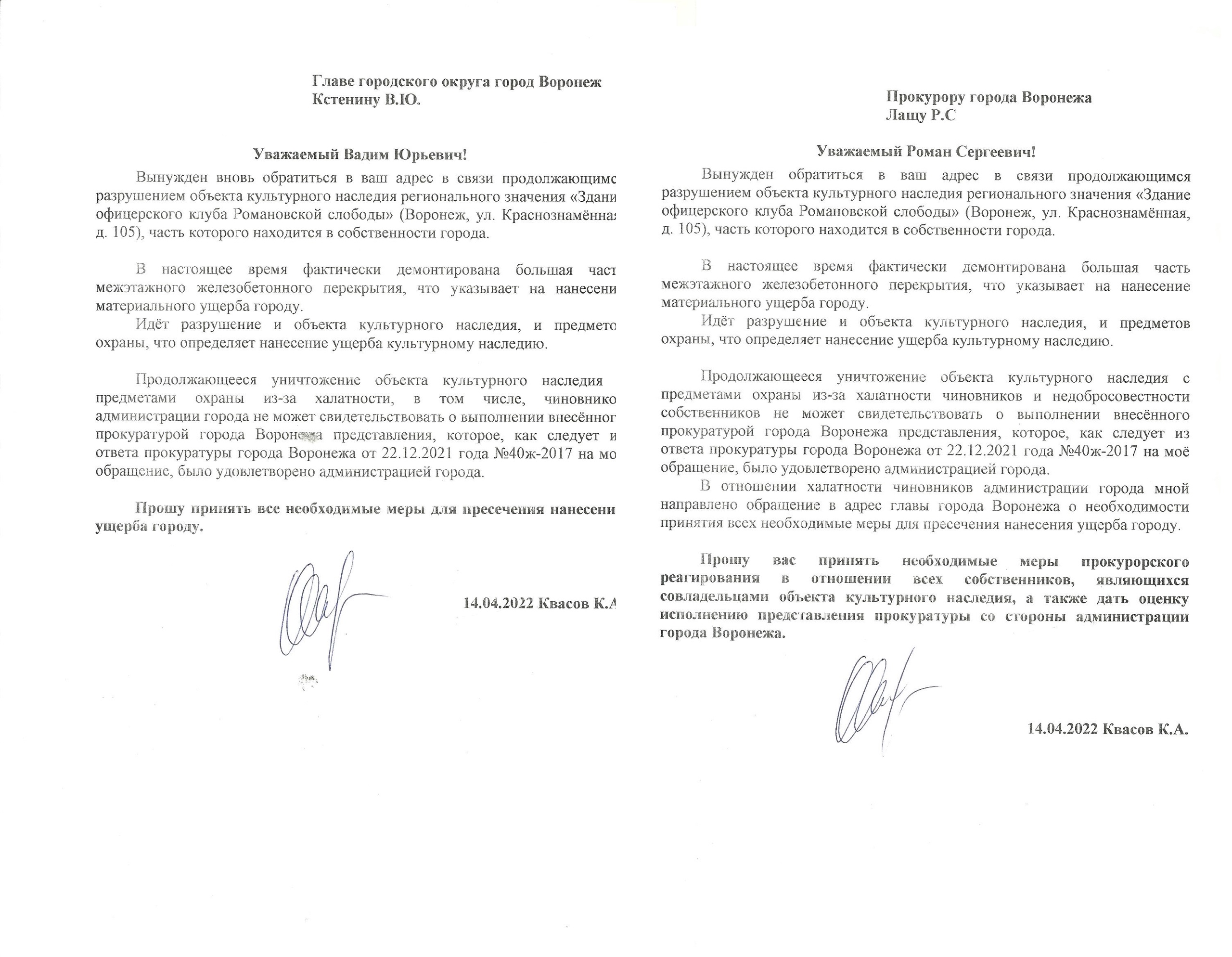 В очередной раз обратился в адрес главы и прокурора города в связи продолжающимся разрушением объекта культурного наследия регионального значения «Здание офицерского клуба Романовской слободы» (Воронеж, ул. Краснознамённая, д. 105), часть которого находится в собственности города.