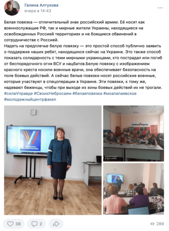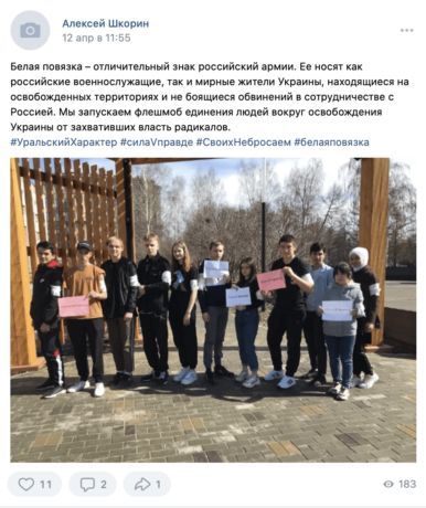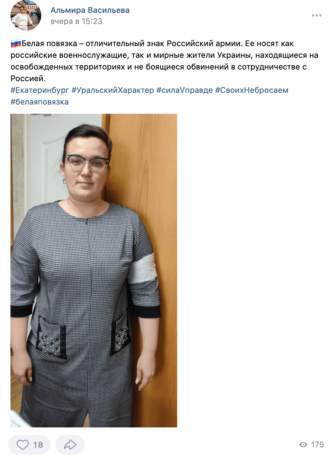 С 11 апреля во «ВКонтакте» появляются фотографии россиян с примерно одинаковыми текстами под тегами #белаяповязка или #белаяпоVяZка . Пользователи пишут, что белая повязка — это «отличительная черта российских военных на Украине и мирных жителей страны, не боящихся обвинений в сотрудничестве с Россией».