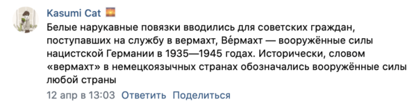 Под многими постами во «ВКонтакте» один и тот же пользователь отмечает, что белые повязки похожи на те, что носили советские граждане, которые поступали на службу в вермахт.