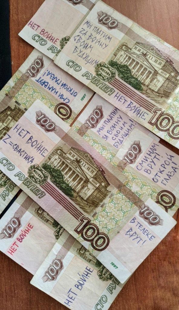 Одна из подписчиц ФАС из Саратова рассказала движению, что расплачивалась в магазине купюрами с надписью «Нет войне» и столкнулась с неожиданной реакцией кассиров. «Девушка-продавец увидела мою надпись, толкнула локтем парня-продавца, он тоже посмотрел на деньги, а потом пристально на меня, я подумала, ну вот, сейчас чекистов вызовут. А он мне говорит: “Слава Украине!”. А девушка-продавец отвечает: “Героям Слава!”. И я им в ответ: “Нет войне в Украине!”».