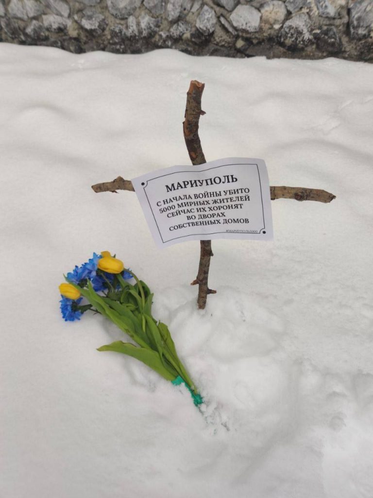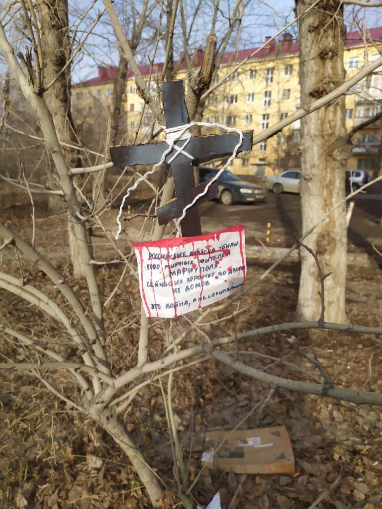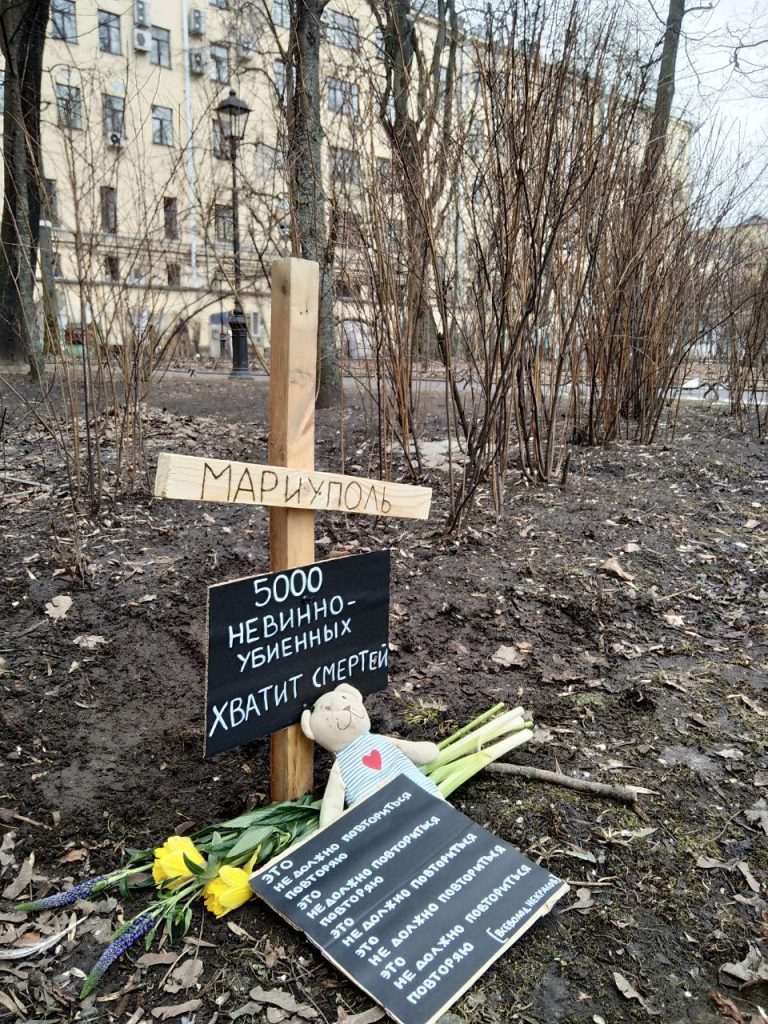 «Феминистское антивоенное сопротивление» (ФАС) предложило устанавливать могильные кресты с табличками во дворах жилых домов — в память о погибших в Мариуполе, которых приходится хоронить таким образом из-за блокады города (в конце марта, по словам городских властей, жертв среди мирного населения было около пяти тысяч человек, на 12 апреля власти Украины оценивали количество погибших в 20-22 тысячи человек. — Прим. «Холода»). Акцию объявили в начале апреля. Только за первые два дня в ней приняли участие жители 40 городов России.