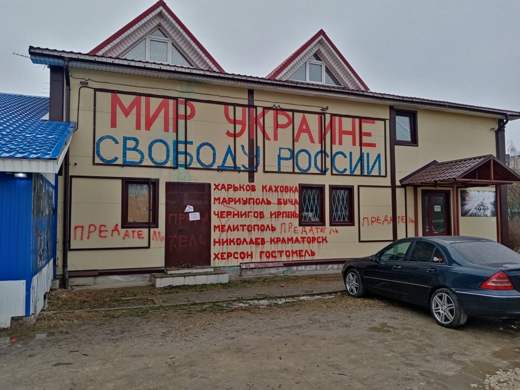 Скурихин еще несколько лет назад сделал на фасаде своего магазина в селе Русско-Высоцкое надпись «Мир Украине, свободу России». А после начала войны дополнил ее списком украинских городов, пострадавших от обстрелов и занятых российской армией.
